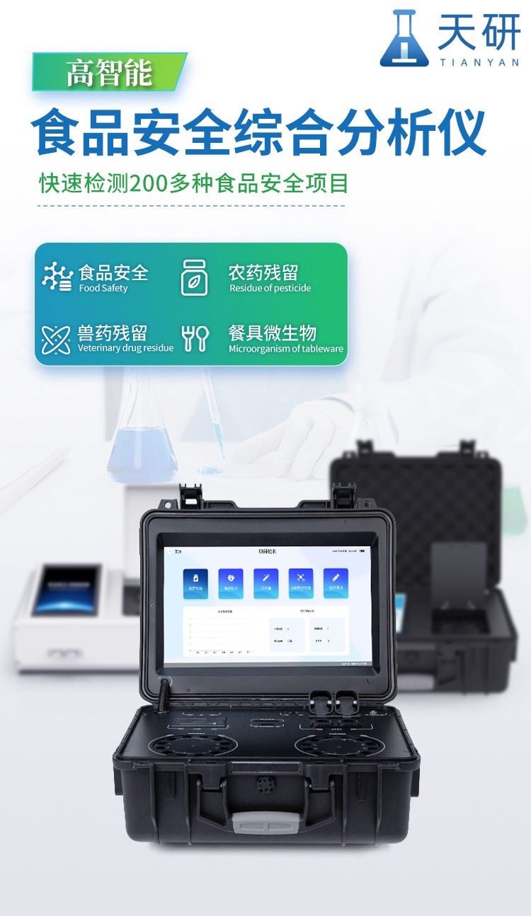 山東天研儀器有限公司生產的高智能食品安全檢測儀為集成化食品安全快速檢測分析設備,采用臺式一體化設計,可快速檢測200多種食品安全項目,包含非食用化學物質、濫用食品添加劑、農藥殘留、獸藥殘留、重金屬、病害肉、營養(yǎng)強化劑、抗生素類殘留、激素類殘留、真菌毒素類殘留、化學類殘留等項目的定性定量檢測。目前廣泛應用于市場監(jiān)管局、檢測中心、衛(wèi)生監(jiān)督部門、農業(yè)部門、院校及各單位食堂、食品肉產品深加工企業(yè)、商超市場、司法部門、餐飲機構、養(yǎng)殖場、屠宰場、檢驗檢疫部門等單位。