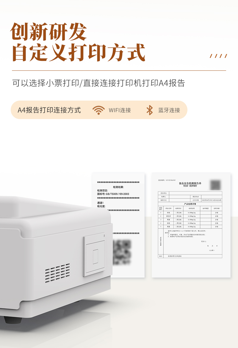 | 儀器采用手提一體化系統(tǒng)檢測技術(shù),將分光光度模塊、膠體金檢測模塊、新型農(nóng)殘檢測模塊、數(shù)字化管理模塊、無線通訊模塊高度集成于一體,支持檢測200種食品安全檢測項(xiàng)目,同時(shí)預(yù)留升級(jí)檢測方法。 | 儀器檢測模塊標(biāo)準(zhǔn)化、智能化,檢測項(xiàng)目可隨意自由組合。檢測箱體內(nèi)置多個(gè)標(biāo)準(zhǔn)檢測單元,檢測模塊可以調(diào)整配置。 | 顯示屏幕:儀器采用10.1英寸豎向液晶觸摸屏顯,搭配運(yùn)行安卓智能操作系統(tǒng),主控芯片采用ARM Cortex-A7,RK3288/4核處理器,主頻1.88Ghz,操作方便,性能更強(qiáng)。 | 檢測通道:≥12通道;采用精密旋轉(zhuǎn)比色池設(shè)計(jì),使用同芯片同光源校準(zhǔn)精度,解決不同光源之間的誤差值,更加準(zhǔn)確**。(1-12通道間誤差0.1%,**號(hào):ZL202022821055.2) | 儀器光源:高精度進(jìn)口四波長冷光源,每個(gè)通道均配置 410、520、590、630nm 波長光源,標(biāo)配**的光路切換裝置,**光路切換功能可實(shí)現(xiàn)64波長,并且所有檢測項(xiàng)目可實(shí)現(xiàn)所有通道同時(shí)檢測。 | 設(shè)備可一鍵校準(zhǔn),自動(dòng)保存校準(zhǔn)數(shù)據(jù),自動(dòng)對比校驗(yàn),得到精準(zhǔn)光源,采用Android SP存儲(chǔ)數(shù)據(jù),光源數(shù)據(jù)永不丟失,方便每一次使用。 | 通訊接口:配備無線通信模塊、4G(APN)通訊模塊、藍(lán)牙傳輸,同時(shí)具有雙USB接口以及RJ45網(wǎng)線接口,可以多方式實(shí)現(xiàn)數(shù)據(jù)保存及數(shù)據(jù)傳輸。 | 存儲(chǔ)方式:支持U盤存儲(chǔ),標(biāo)準(zhǔn)USB接口,免驅(qū)動(dòng)安裝。檢測結(jié)果存儲(chǔ)容量20萬條以上,可生成Excel表格進(jìn)行拷貝,并具有登錄保護(hù)功能。 | 智能化操作系統(tǒng):: ★操作系統(tǒng):儀器可在同一檢測界面自動(dòng)對應(yīng)相關(guān)檢測通道,一次性選擇1-12個(gè)樣品名稱,無需退出界面,節(jié)省操作時(shí)間。并可以對每個(gè)通道屬性和樣品信息單獨(dú)進(jìn)行編輯,例如送檢單位、人員,檢測人員等,打印時(shí)勾選打印顯示。 | ★數(shù)據(jù)集成系統(tǒng):設(shè)備首頁自動(dòng)匯總分析檢測數(shù)據(jù),包含:周檢測數(shù)據(jù)、月檢測數(shù)據(jù),全部檢測總數(shù)量,均包含檢測總數(shù),合格數(shù),不合格數(shù),以及相關(guān)柱形分析圖,各項(xiàng)檢測數(shù)據(jù)一目了然,無需電腦查詢,更加快捷直觀。 | ★數(shù)據(jù)庫系統(tǒng):十幾項(xiàng)數(shù)據(jù)庫分類管理儀器:包含項(xiàng)目類型、項(xiàng)目數(shù)據(jù)、檢測數(shù)據(jù)、歷史記錄、國標(biāo)信息、曲線信息、采樣信息、檢測信息、受檢信息、復(fù)核信息、圖表信息、光源校準(zhǔn)信息、打印樣式信息、樣品庫信息等等,數(shù)據(jù)庫之間互相協(xié)調(diào)聯(lián)動(dòng)保證數(shù)據(jù)的真實(shí)完整性。同時(shí)產(chǎn)品數(shù)據(jù)庫以及歷史檢測記錄支持一鍵檢索功能。 | ★限量規(guī)判系統(tǒng):具有限量查詢、添加物質(zhì)合規(guī)判定系統(tǒng)。檢測出結(jié)果后,系統(tǒng)自動(dòng)調(diào)用系統(tǒng)數(shù)據(jù)庫中相關(guān)國標(biāo)進(jìn)行比對判定,客觀顯示判定結(jié)果是否合格 | ★項(xiàng)目預(yù)設(shè)系統(tǒng):儀器具有任務(wù)預(yù)設(shè)模塊,一鍵提前預(yù)設(shè),給出方便快捷的新檢測方案,每一個(gè)任務(wù)分別可以設(shè)置不同的樣品、批次、編號(hào)、來源、備注、抽樣信息、檢測信息、受檢信息、復(fù)核信息等更多信息。樣品送檢時(shí)一鍵調(diào)取保存信息,并可多次調(diào)取,大大提高檢測效率。 | ★數(shù)據(jù)監(jiān)管系統(tǒng):同步對接監(jiān)管平臺(tái),數(shù)據(jù)可局域網(wǎng)和互聯(lián)網(wǎng)數(shù)據(jù)上傳,檢測結(jié)果可選擇直接傳至食品安全監(jiān)管平臺(tái)。進(jìn)行區(qū)域食品安全監(jiān)管及大數(shù)據(jù)分析處理與數(shù)據(jù)統(tǒng)計(jì),檢測區(qū)域食品安全長短期動(dòng)態(tài),達(dá)到食品安全問題預(yù)估、預(yù)警。 | ★打印系統(tǒng):內(nèi)置全新打印機(jī),新創(chuàng)自定義打印方式,可按需靈活勾選控制:產(chǎn)品合格證(國家農(nóng)業(yè)部標(biāo)準(zhǔn)要求),二維碼,抽樣信息、檢測信息,受檢信息、復(fù)核信息、抽樣日期、檢測日期等信息的打印。 | 供電模式:儀器交直流兩用,直流12V供電,可連接車載電源,可配6ah大容量充電鋰電池,電量可實(shí)時(shí)顯示,方便戶外流動(dòng)測試。 | 膠體金檢測模塊:采用雙通道CMOS成像處理技術(shù)及膠體金免疫層析技術(shù),可同時(shí)讀取雙膠體金卡數(shù)據(jù),自動(dòng)采集、處理分析,將檢測結(jié)果顯示,并可根據(jù)參考限值自動(dòng)判斷檢測結(jié)果,可檢測常見的獸藥殘留、生物毒素、抗生素、違禁添加物等。 | ★探測技術(shù):CMOS成像探測; | ★檢測通道:1個(gè)通道; | ★檢測方式:消線法和比色法; | ★顯示模式:陰性或陽性; | 曲線形式:軌道式掃描方式,顯示金標(biāo)卡圖像,實(shí)時(shí)生成、識(shí)別CT曲線圖,無需手動(dòng)調(diào)整,完成檢測后自動(dòng)退出檢測卡。兼容市場上其他金標(biāo)卡,使用耗材不受限制。 | 儀器具備遠(yuǎn)程升級(jí)功能,可定向分客戶分儀器更新,開機(jī