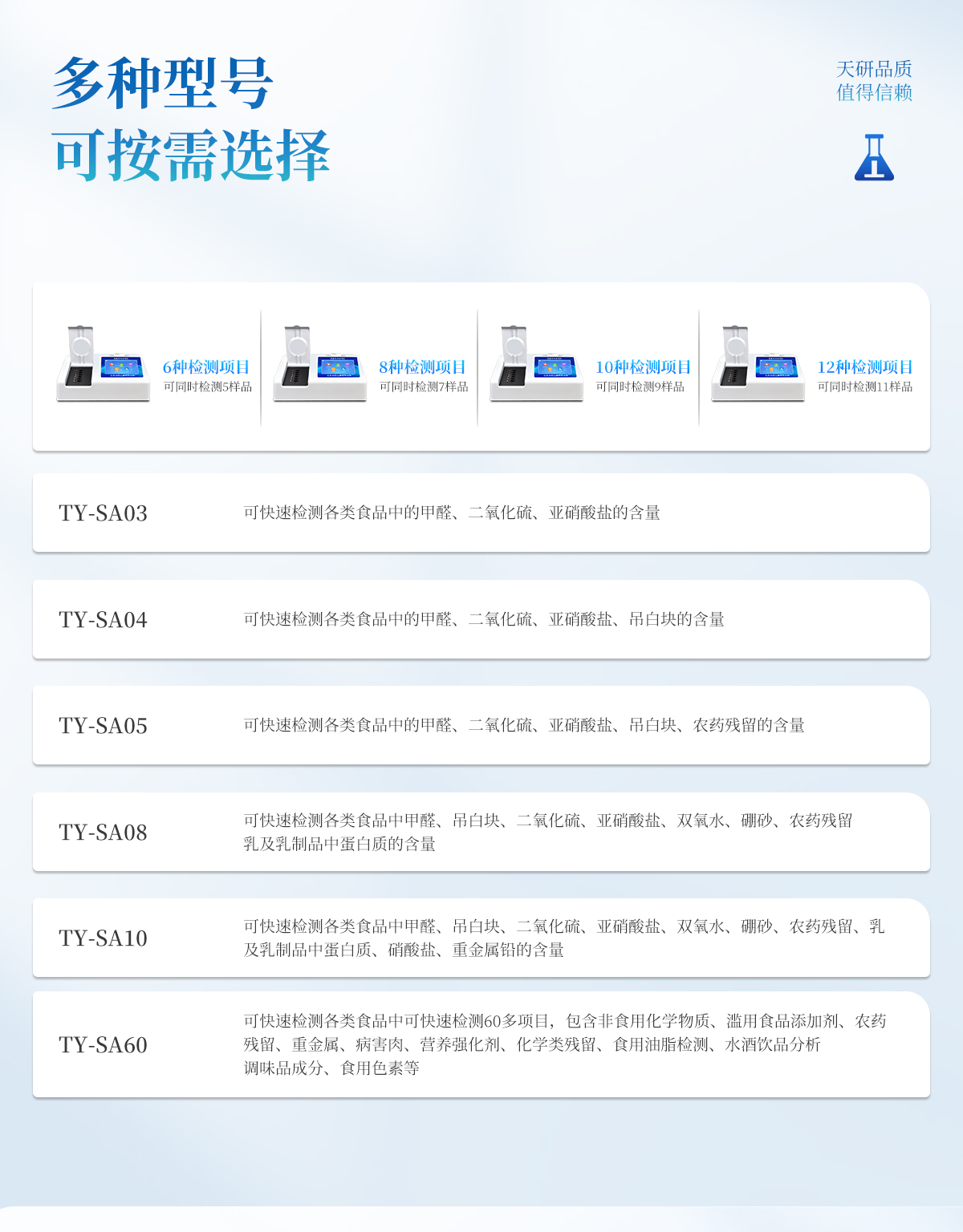 可快速檢測(cè)各類(lèi)食品中的甲醛、二氧化硫、亞硝酸鹽、吊白塊的含量,儀器預(yù)留其他項(xiàng)目檢測(cè)程序和端口,根據(jù)日后需求可方便的自主增加檢測(cè)項(xiàng)目。