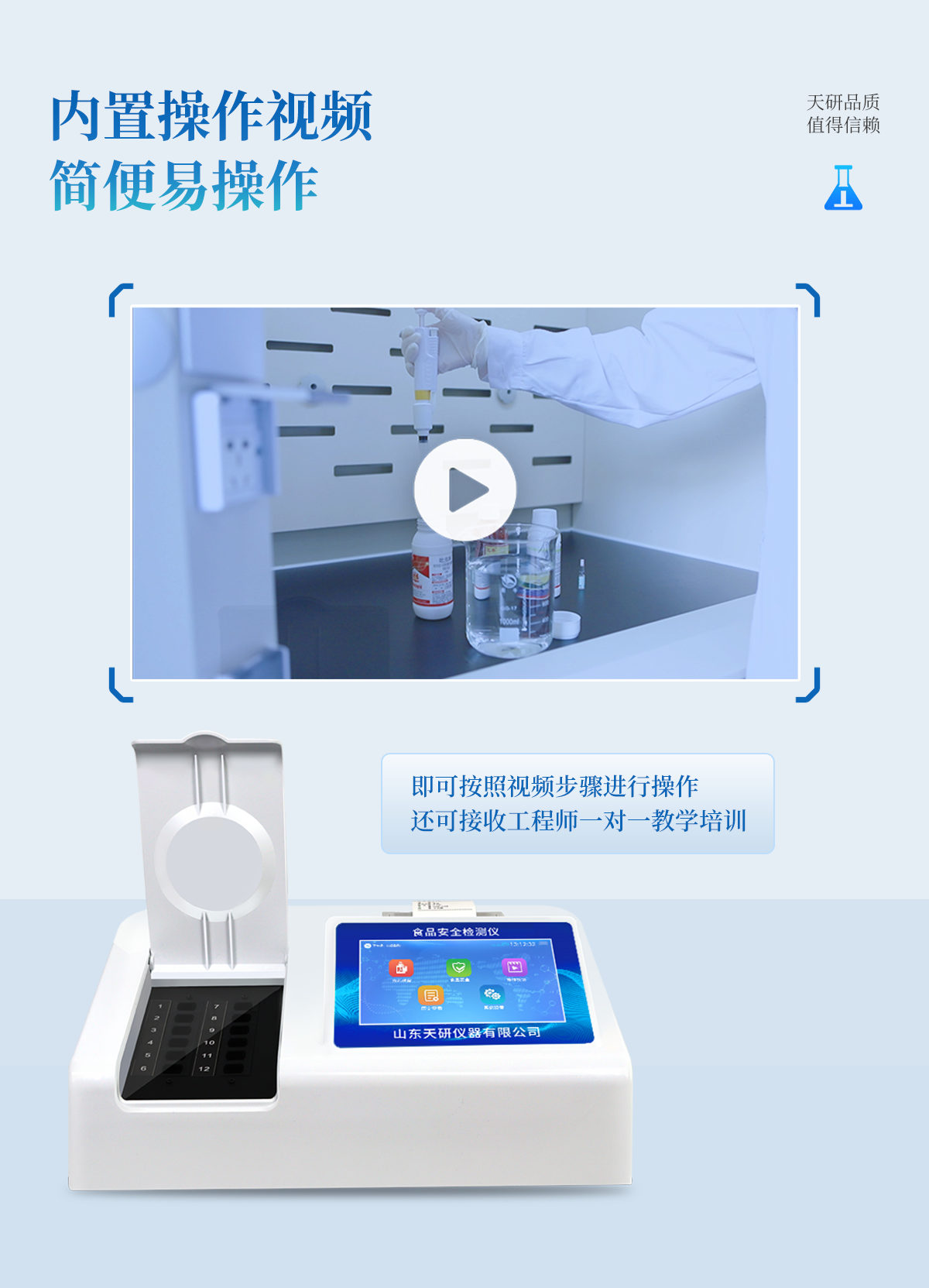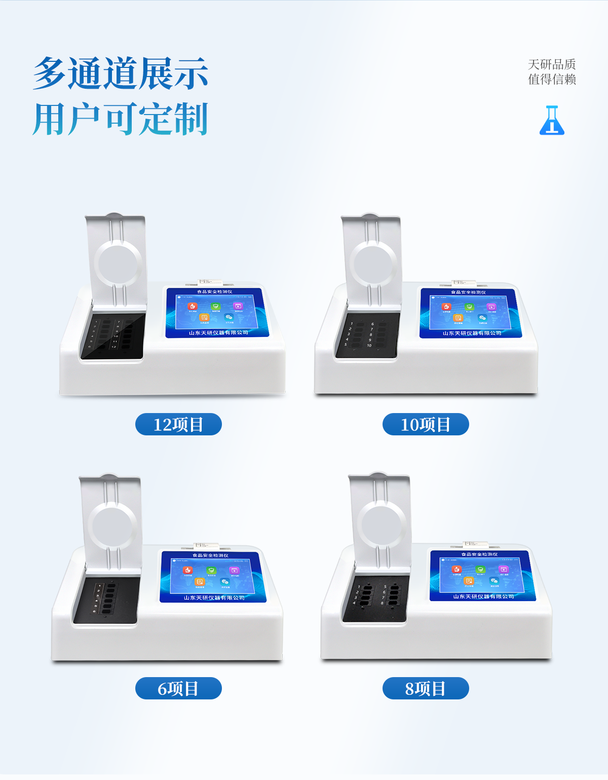 | 安卓智能操作系統(tǒng),采用更加**和人性化操作,儀器具有網(wǎng)線連接、wifi聯(lián)網(wǎng)上傳、GPRS無線遠傳功能,快速上傳數(shù)據(jù)。 | 智能化程度高,儀器具有自檢功能:具有開機自檢和調(diào)零功能,具有自動檢測重復性功能。 | 檢測通道:≥12個檢測通道,可以同時測試多個樣品,每個樣品由程序控制分別獨立工作,不會互相干擾。 | 顯示方式:≥8英寸液晶觸摸屏顯示,人性化中文操作界面,讀數(shù)直觀、簡單。 | 配備新一代嵌入式熱敏打印機,可選擇手動打印或者自動打印,檢測完成可自動打印檢測報告和二維碼。 | 光源采用進口超高亮發(fā)光二極管,高精度、穩(wěn)定性強、光源可控、可以關(guān)掉不使用的光源,功耗更低。 | 采用USB2.0接口設(shè)計,方便數(shù)據(jù)的存貯和移動,并可隨時與計算機直接相連,并且可用計算機控制儀器。實現(xiàn)數(shù)據(jù)查詢、瀏覽、分析、統(tǒng)計、打印等。 | 儀器帶有監(jiān)管平臺。數(shù)據(jù)可局域網(wǎng)和互聯(lián)網(wǎng)數(shù)據(jù)上傳,檢測結(jié)果直接傳至食品安全監(jiān)管平臺。進行區(qū)域食品安全監(jiān)管及大數(shù)據(jù)分析處理,檢測區(qū)域食品安全長短期動態(tài),達到食品安全問題預(yù)估、預(yù)警 | 一體化便攜式快檢設(shè)備,滿足現(xiàn)場及流動檢測使用需求,能夠在同一軟件下實現(xiàn)所有檢測項目的檢測,并可通過同一窗口直觀顯示檢測結(jié)果。 | 儀器具有多品類多種類樣品菜單庫,可靈活選擇檢測樣品,不同的檢測通道可同時檢測不同的樣品項目。也可在儀器上直接編輯錄入樣品名稱、檢測指標、送檢單位等信息并保存進樣品數(shù)據(jù)庫。 | 樣品處理簡單省力,整體操作快速、安全、便捷。 | 儀器具有自身保護功能,可設(shè)置用戶名及密碼,防止非工作人員操作等。 | 高靈敏度,高檢測精度,高重復性精度,掃描式高精度光學傳感器。 | 儀器具有重新校準、鎖定、恢復出廠設(shè)置功能。 | 支持U盤存儲。 結(jié)果判定線可修改,對照值標定值可保存,斷電不丟失數(shù)據(jù)。 |
