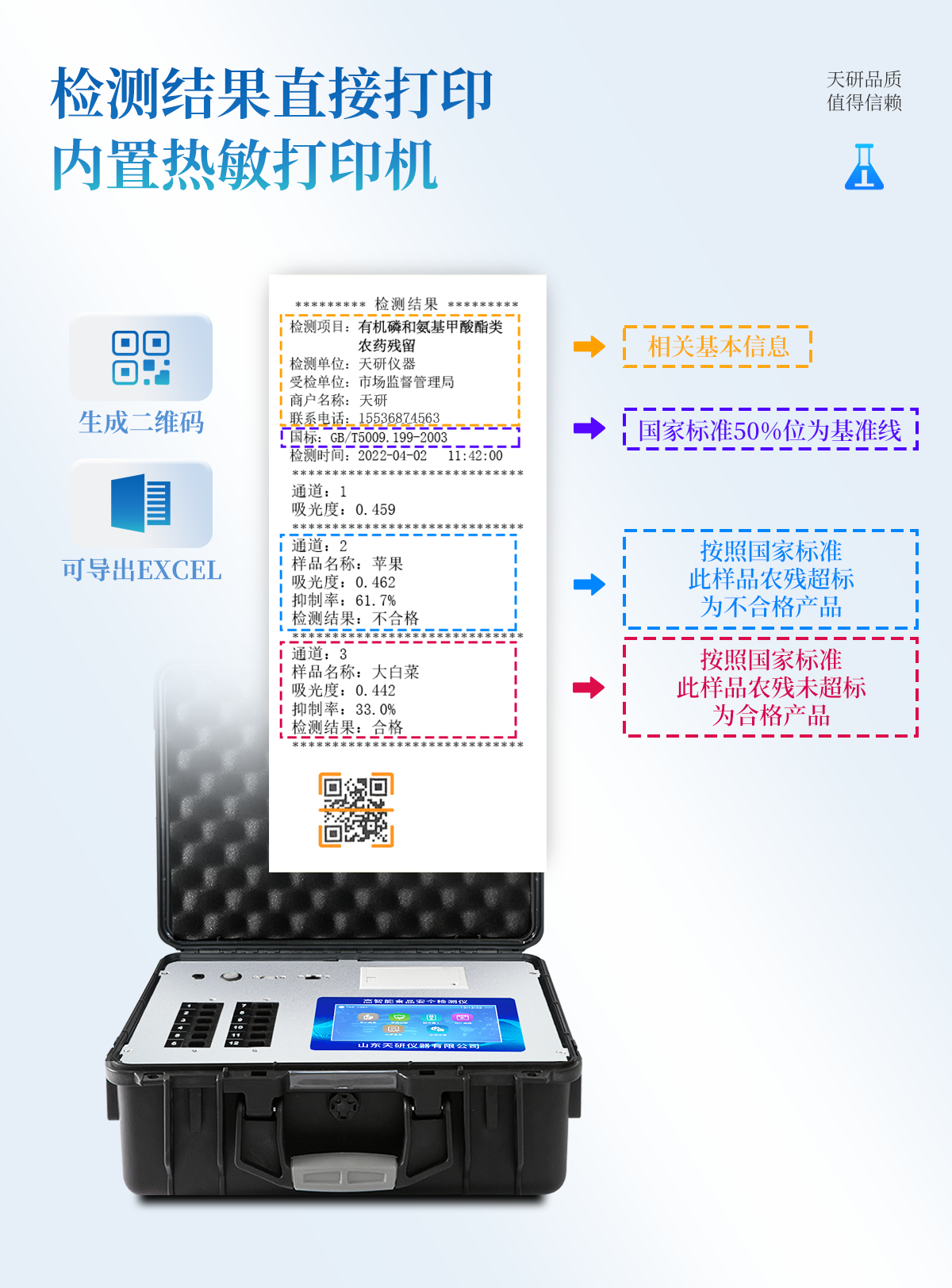 | 安卓智能操作系統(tǒng),采用更加**的UI交互界面,儀器具有wifi聯(lián)網(wǎng)上傳、4G聯(lián)網(wǎng)傳輸、GPRS無線遠(yuǎn)傳、網(wǎng)線連接功能,快速批量上傳數(shù)據(jù)。 | 智能化程度高,儀器具有自檢功能:具有開機自檢和調(diào)零功能,具有自動檢測重復(fù)性功能。 | 新一代高速熱敏打印機,檢測完成可自動打印或批量打印檢測報告和二維碼。 | 儀器帶有監(jiān)管平臺,數(shù)據(jù)可局域網(wǎng)和互聯(lián)網(wǎng)數(shù)據(jù)上傳,檢測結(jié)果直接傳至食品安全監(jiān)管平臺。進(jìn)行區(qū)域食品安全監(jiān)管及大數(shù)據(jù)分析處理與數(shù)據(jù)統(tǒng)計,檢測區(qū)域食品安全長短期動態(tài),達(dá)到食品安全問題預(yù)估、預(yù)警 | 一體化主機,包含食品安全檢測模塊、多通道農(nóng)藥殘留檢測模塊、膠體金免疫層析檢測模塊。 | 一體化便攜式快檢設(shè)備,滿足現(xiàn)場及流動檢測使用需求,能夠在同一軟件下實現(xiàn)所有檢測項目的檢測,并可通過同一窗口直觀顯示檢測結(jié)果。 | 膠體金模塊檢測方式:軌道式自動傳輸掃描,檢測完成后自動退出檢測卡。 | CT線自動識別,無需手動調(diào)整。 | 內(nèi)置強大的數(shù)據(jù)庫,具有多品類多種類樣品菜單功能,可靈活選擇檢測樣品,不同的檢測通道可同時檢測不同的樣品項目。也可在儀器上直接編輯錄入樣品名稱、檢測指標(biāo)、送檢單位等信息并保存進(jìn)樣品數(shù)據(jù)庫。 | 產(chǎn)品內(nèi)置操作演示視頻,是您身邊的化驗指導(dǎo)專家。 | 樣品處理簡單省力,整體操作快速、安全、便捷。 | 儀器具有自身保護(hù)功能,可設(shè)置用戶名及密碼,防止非工作人員操作等。 | 高靈敏度,高檢測精度,高重復(fù)性精度,掃描式高精度光學(xué)傳感器。 | 結(jié)果判定線可修改,對照值標(biāo)定值可保存,斷電不丟失數(shù)據(jù)。 | 兼容市場上所有的膠體金卡,使用耗材不受限制,極大增強用戶使用體驗。 | 儀器具有重新校準(zhǔn)、鎖定、恢復(fù)出廠設(shè)置功能。 |