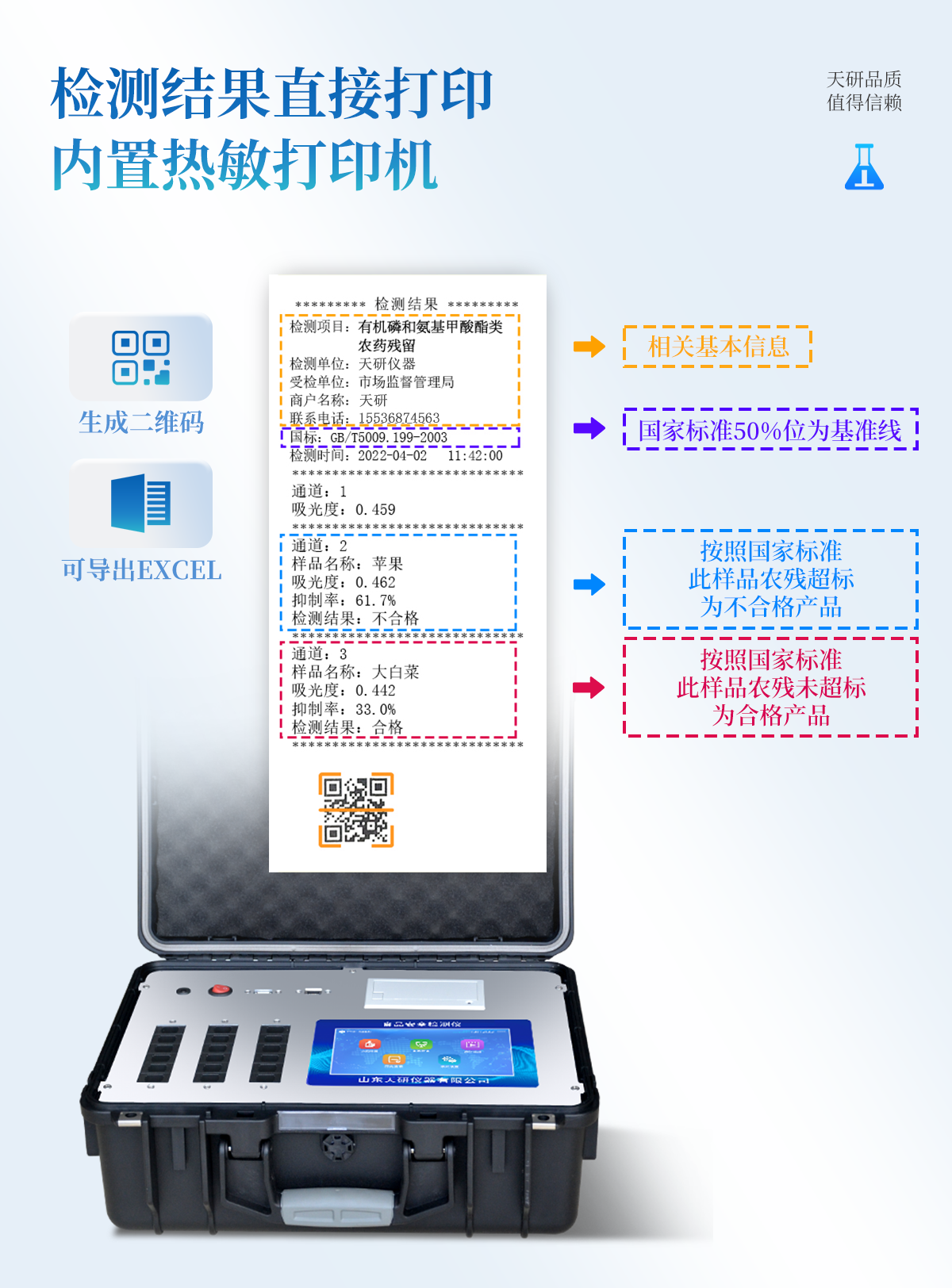 | 安卓智能操作系統(tǒng),采用更加**的UI交互界面,儀器具有wifi聯(lián)網(wǎng)上傳、4G聯(lián)網(wǎng)傳輸、GPRS無線遠(yuǎn)傳、網(wǎng)線連接功能,快速批量上傳數(shù)據(jù)。 | 智能化程度高,儀器具有自檢功能:具有開機(jī)自檢和調(diào)零功能,具有自動(dòng)檢測重復(fù)性功能。 | 新一代高速熱敏打印機(jī),檢測完成可自動(dòng)打印或批量打印檢測報(bào)告和二維碼。 | 儀器帶有監(jiān)管平臺(tái),數(shù)據(jù)可局域網(wǎng)和互聯(lián)網(wǎng)數(shù)據(jù)上傳,檢測結(jié)果直接傳至食品安全監(jiān)管平臺(tái)。進(jìn)行區(qū)域食品安全監(jiān)管及大數(shù)據(jù)分析處理與數(shù)據(jù)統(tǒng)計(jì),檢測區(qū)域食品安全長短期動(dòng)態(tài),達(dá)到食品安全問題預(yù)估、預(yù)警 | 一體化主機(jī),包含食品安全檢測模塊、多通道農(nóng)藥殘留檢測模塊、膠體金免疫層析檢測模塊。 | 一體化便攜式快檢設(shè)備,滿足現(xiàn)場及流動(dòng)檢測使用需求,能夠在同一軟件下實(shí)現(xiàn)所有檢測項(xiàng)目的檢測,并可通過同一窗口直觀顯示檢測結(jié)果。 | 膠體金模塊檢測方式:軌道式自動(dòng)傳輸掃描,檢測完成后自動(dòng)退出檢測卡。 | CT線自動(dòng)識(shí)別,無需手動(dòng)調(diào)整。 | 內(nèi)置強(qiáng)大的數(shù)據(jù)庫,具有多品類多種類樣品菜單功能,可靈活選擇檢測樣品,不同的檢測通道可同時(shí)檢測不同的樣品項(xiàng)目。也可在儀器上直接編輯錄入樣品名稱、檢測指標(biāo)、送檢單位等信息并保存進(jìn)樣品數(shù)據(jù)庫。 | 產(chǎn)品內(nèi)置操作演示視頻,是您身邊的化驗(yàn)指導(dǎo)專家。 | 樣品處理簡單省力,整體操作快速、安全、便捷。 | 儀器具有自身保護(hù)功能,可設(shè)置用戶名及密碼,防止非工作人員操作等。 | 高靈敏度,高檢測精度,高重復(fù)性精度,掃描式高精度光學(xué)傳感器。 | 結(jié)果判定線可修改,對(duì)照值標(biāo)定值可保存,斷電不丟失數(shù)據(jù)。 | 兼容市場上所有的膠體金卡,使用耗材不受限制,極大增強(qiáng)用戶使用體驗(yàn)。 | 儀器具有重新校準(zhǔn)、鎖定、恢復(fù)出廠設(shè)置功能。 |