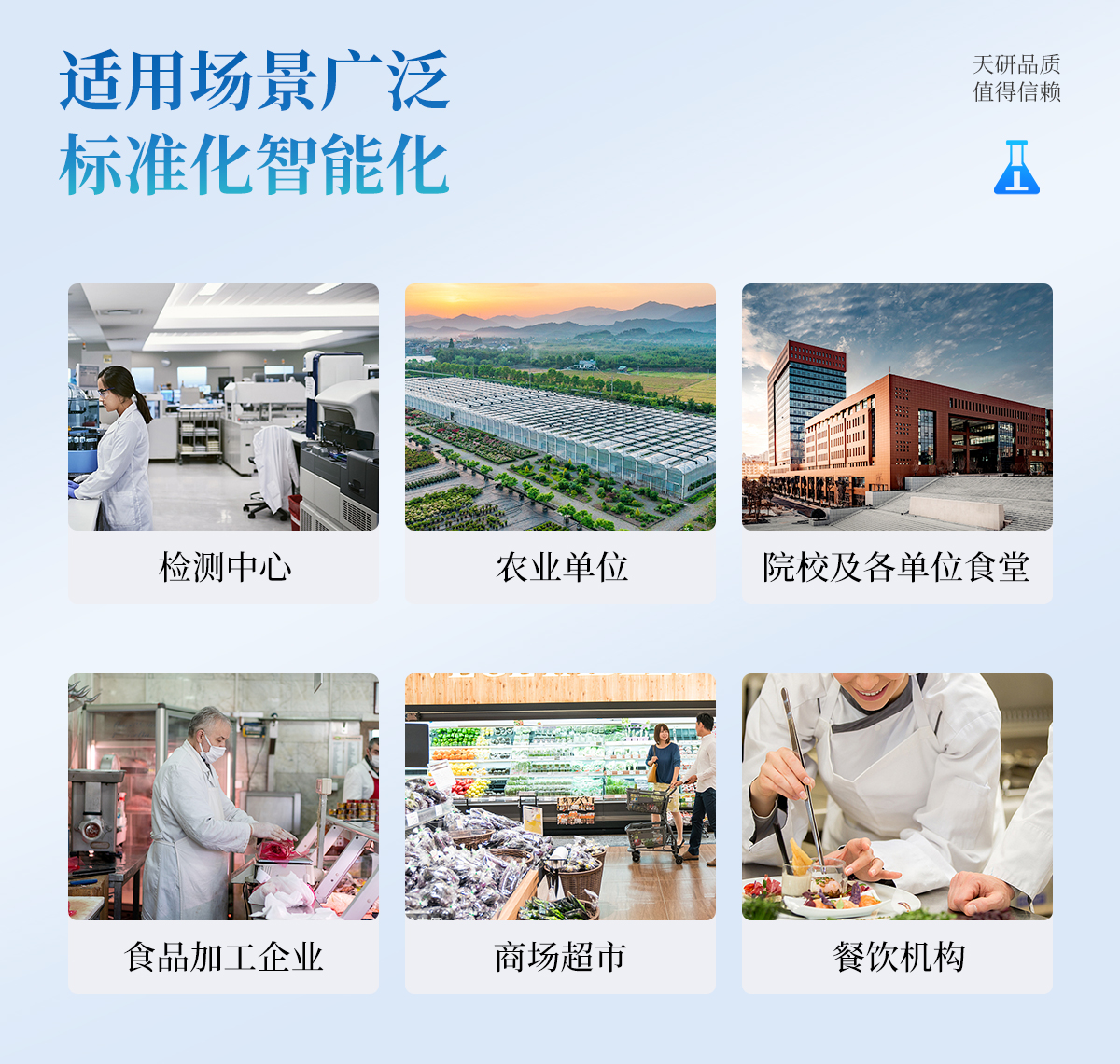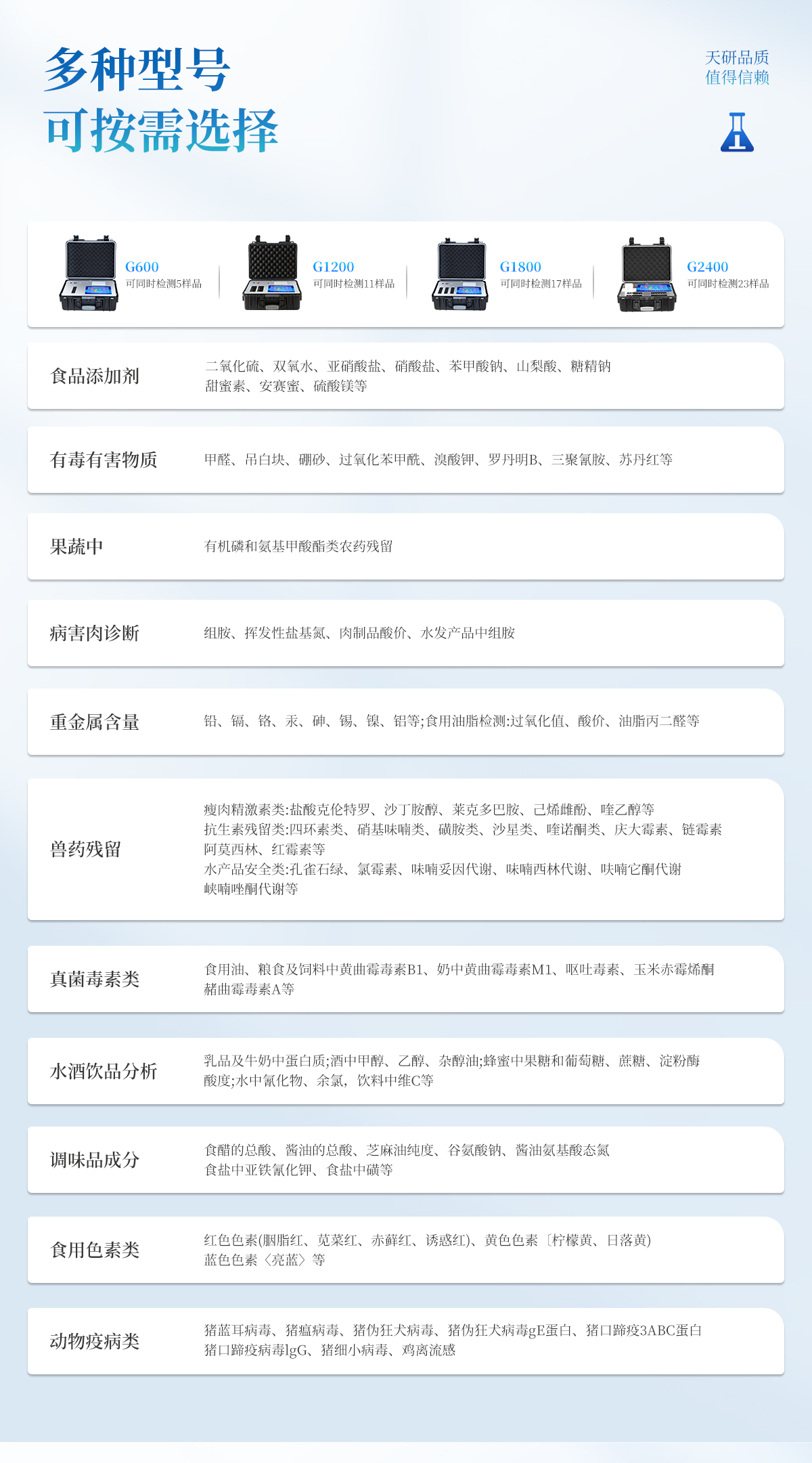 | 食品添加劑:二氧化硫、雙氧水、亞硝酸鹽、硝酸鹽、苯甲酸鈉、山梨酸、糖精鈉、甜蜜素、安賽蜜、硫酸鎂等 | 有毒有害物質(zhì):甲醛、吊白塊、硼砂、過氧化苯甲酰、溴酸鉀、羅丹明B、三聚氰胺、蘇丹紅等 | 果蔬中:有機(jī)磷和氨基甲酸酯類農(nóng)藥殘留; | 病害肉診斷:組胺、揮發(fā)性鹽基氮、肉制品酸價(jià)、水發(fā)產(chǎn)品中組胺 | 重金屬含量:鉛、鎘、鉻、汞、砷、錫、鎳、鋁等;食用油脂檢測:過氧化值、酸價(jià)、油脂丙二醛等。 | 瘦肉精激素類(獸藥):鹽酸克倫特羅、沙丁胺醇、萊克多巴胺、己烯雌酚、喹乙醇等 | 抗生素殘留類(獸藥):四環(huán)素類、硝基呋喃類、磺胺類、沙星類、喹諾酮類、慶大霉素、鏈霉素、阿莫西林、紅霉素等 | 水產(chǎn)品安全類:孔雀石綠、氯霉素、呋喃妥因代謝、呋喃西林代謝、呋喃它酮代謝、呋喃唑酮代謝等 | 真菌毒素類:食用油、糧食及飼料中黃曲霉毒素B1、奶中黃曲霉毒素M1、嘔吐毒素、玉米赤霉烯酮、赭曲霉毒素A等 | 水酒飲品分析:乳品及牛奶中蛋白質(zhì);酒中甲醇、乙醇、雜醇油;蜂蜜中果糖和葡萄糖、蔗糖、淀粉酶、酸度;水中氰化物、余氯,飲料中維C等 | 調(diào)味品成分:食醋的總酸、醬油的總酸、芝麻油純度、谷氨酸鈉、醬油氨基酸態(tài)氮、食鹽中亞鐵氰化鉀、食鹽中碘等 | 食用色素類:紅色色素(胭脂紅、莧菜紅、赤蘚紅、誘惑紅)、黃色色素(檸檬黃、日落黃)、藍(lán)色色素(亮藍(lán))等 | 動(dòng)物疫病類:豬藍(lán)耳病毒、豬瘟病毒、豬偽狂犬病毒、豬偽狂犬病毒gE蛋白、豬口蹄疫3ABC蛋白、豬口蹄疫病毒IgG、豬細(xì)小病毒、雞禽流感等 |