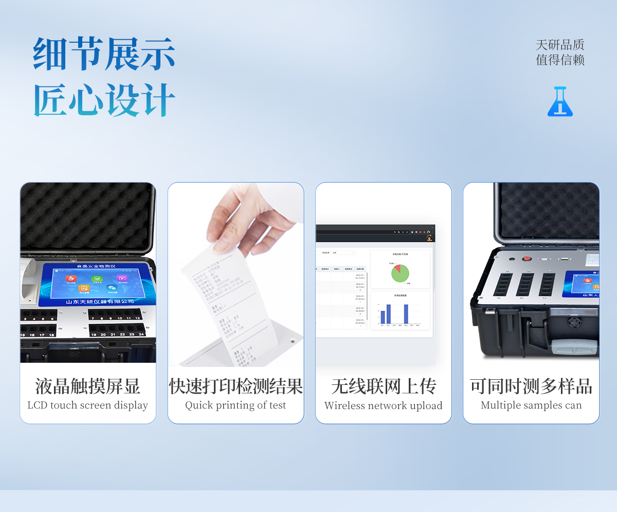 | 安卓智能操作系統(tǒng),采用更加**的UI交互界面,儀器具有wifi聯(lián)網(wǎng)上傳、4G聯(lián)網(wǎng)傳輸、GPRS無線遠(yuǎn)傳、網(wǎng)線連接功能,快速批量上傳數(shù)據(jù)。 | 智能化程度高,儀器具有自檢功能:具有開機(jī)自檢和調(diào)零功能,具有自動檢測重復(fù)性功能。 | 新一代高速熱敏打印機(jī),檢測完成可自動打印或批量打印檢測報(bào)告和二維碼。 | 儀器帶有監(jiān)管平臺,數(shù)據(jù)可局域網(wǎng)和互聯(lián)網(wǎng)數(shù)據(jù)上傳,檢測結(jié)果直接傳至食品安全監(jiān)管平臺。進(jìn)行區(qū)域食品安全監(jiān)管及大數(shù)據(jù)分析處理與數(shù)據(jù)統(tǒng)計(jì),檢測區(qū)域食品安全長短期動態(tài),達(dá)到食品安全問題預(yù)估、預(yù)警 | 一體化主機(jī),包含食品安全檢測模塊、多通道農(nóng)藥殘留檢測模塊、膠體金免疫層析檢測模塊。 | 一體化便攜式快檢設(shè)備,滿足現(xiàn)場及流動檢測使用需求,能夠在同一軟件下實(shí)現(xiàn)所有檢測項(xiàng)目的檢測,并可通過同一窗口直觀顯示檢測結(jié)果。 | 膠體金模塊檢測方式:軌道式自動傳輸掃描,檢測完成后自動退出檢測卡。 | CT線自動識別,無需手動調(diào)整。 | 內(nèi)置強(qiáng)大的數(shù)據(jù)庫,具有多品類多種類樣品菜單功能,可靈活選擇檢測樣品,不同的檢測通道可同時(shí)檢測不同的樣品項(xiàng)目。也可在儀器上直接編輯錄入樣品名稱、檢測指標(biāo)、送檢單位等信息并保存進(jìn)樣品數(shù)據(jù)庫。 | 產(chǎn)品內(nèi)置操作演示視頻,是您身邊的化驗(yàn)指導(dǎo)專家。 | 樣品處理簡單省力,整體操作快速、安全、便捷。 | 儀器具有自身保護(hù)功能,可設(shè)置用戶名及密碼,防止非工作人員操作等。 | 高靈敏度,高檢測精度,高重復(fù)性精度,掃描式高精度光學(xué)傳感器。 | 結(jié)果判定線可修改,對照值標(biāo)定值可保存,斷電不丟失數(shù)據(jù)。 | 兼容市場上所有的膠體金卡,使用耗材不受限制,極大增強(qiáng)用戶使用體驗(yàn)。 | 儀器具有重新校準(zhǔn)、鎖定、恢復(fù)出廠設(shè)置功能。 |