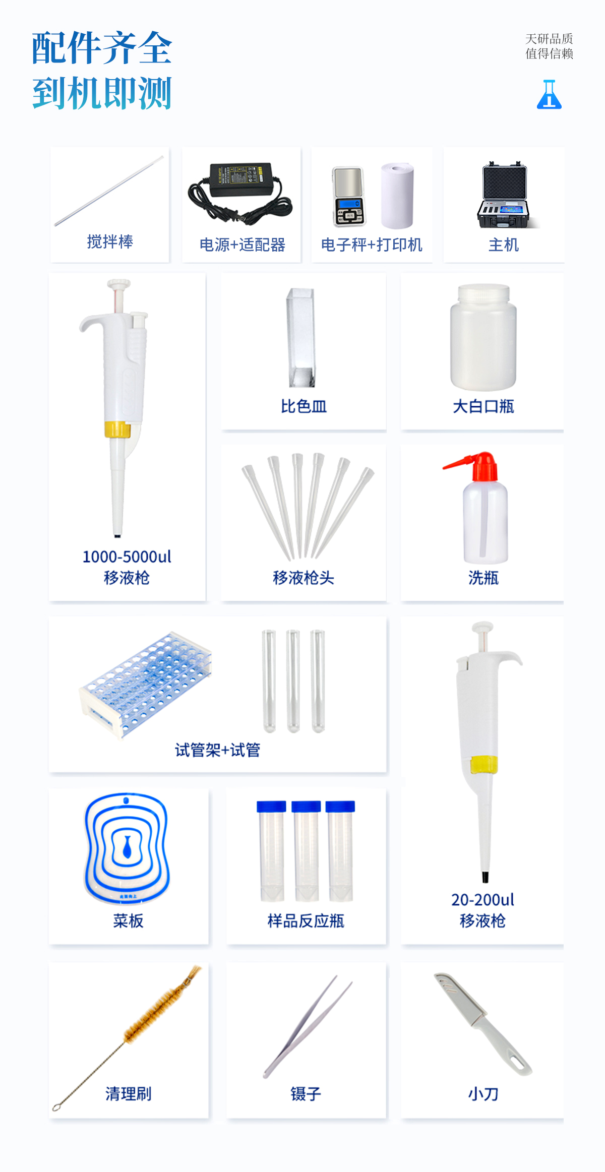 | 食品添加劑:二氧化硫、雙氧水、亞硝酸鹽、硝酸鹽、苯甲酸鈉、山梨酸、糖精鈉、甜蜜素、安賽蜜、硫酸鎂等 | 有毒有害物質(zhì):甲醛、吊白塊、硼砂、過氧化苯甲酰、溴酸鉀、羅丹明B、三聚氰胺、蘇丹紅等 | 果蔬中:有機(jī)磷和氨基甲酸酯類農(nóng)藥殘留; | 病害肉診斷:組胺、揮發(fā)性鹽基氮、肉制品酸價(jià)、水發(fā)產(chǎn)品中組胺 | 重金屬含量:鉛、鎘、鉻、汞、砷、錫、鎳、鋁等;食用油脂檢測:過氧化值、酸價(jià)、油脂丙二醛等。 | 瘦肉精激素類(獸藥):鹽酸克倫特羅、沙丁胺醇、萊克多巴胺、己烯雌酚、喹乙醇等 | 抗生素殘留類(獸藥):四環(huán)素類、硝基呋喃類、磺胺類、沙星類、喹諾酮類、慶大霉素、鏈霉素、阿莫西林、紅霉素等 | 水產(chǎn)品安全類:孔雀石綠、氯霉素、呋喃妥因代謝、呋喃西林代謝、呋喃它酮代謝、呋喃唑酮代謝等 | 真菌毒素類:食用油、糧食及飼料中黃曲霉毒素B1、奶中黃曲霉毒素M1、嘔吐毒素、玉米赤霉烯酮、赭曲霉毒素A等 | 水酒飲品分析:乳品及牛奶中蛋白質(zhì);酒中甲醇、乙醇、雜醇油;蜂蜜中果糖和葡萄糖、蔗糖、淀粉酶、酸度;水中氰化物、余氯,飲料中維C等 | 調(diào)味品成分:食醋的總酸、醬油的總酸、芝麻油純度、谷氨酸鈉、醬油氨基酸態(tài)氮、食鹽中亞鐵氰化鉀、食鹽中碘等 | 食用色素類:紅色色素(胭脂紅、莧菜紅、赤蘚紅、誘惑紅)、黃色色素(檸檬黃、日落黃)、藍(lán)色色素(亮藍(lán))等 | 動物疫病類:豬藍(lán)耳病毒、豬瘟病毒、豬偽狂犬病毒、豬偽狂犬病毒gE蛋白、豬口蹄疫3ABC蛋白、豬口蹄疫病毒IgG、豬細(xì)小病毒、雞禽流感等 |