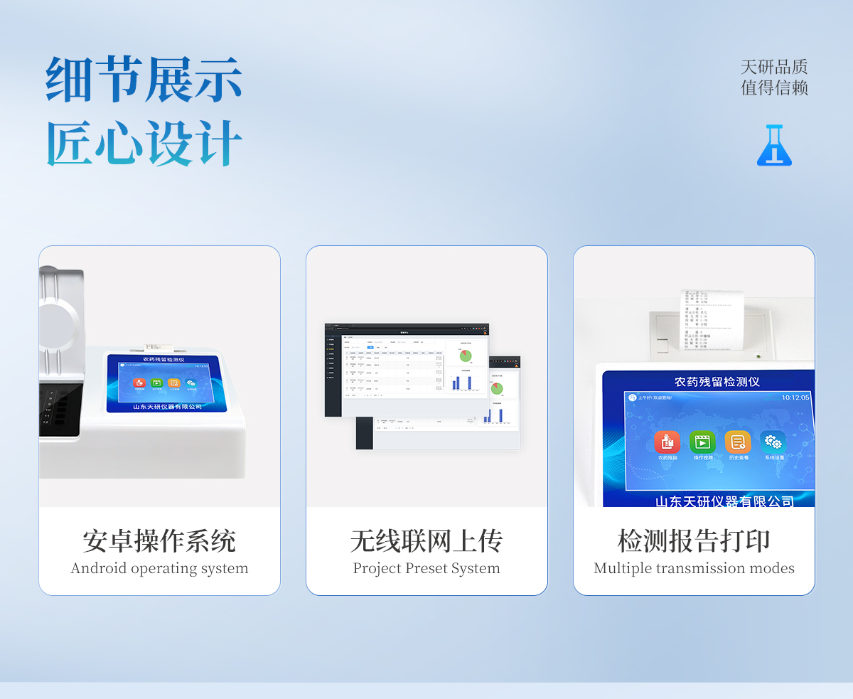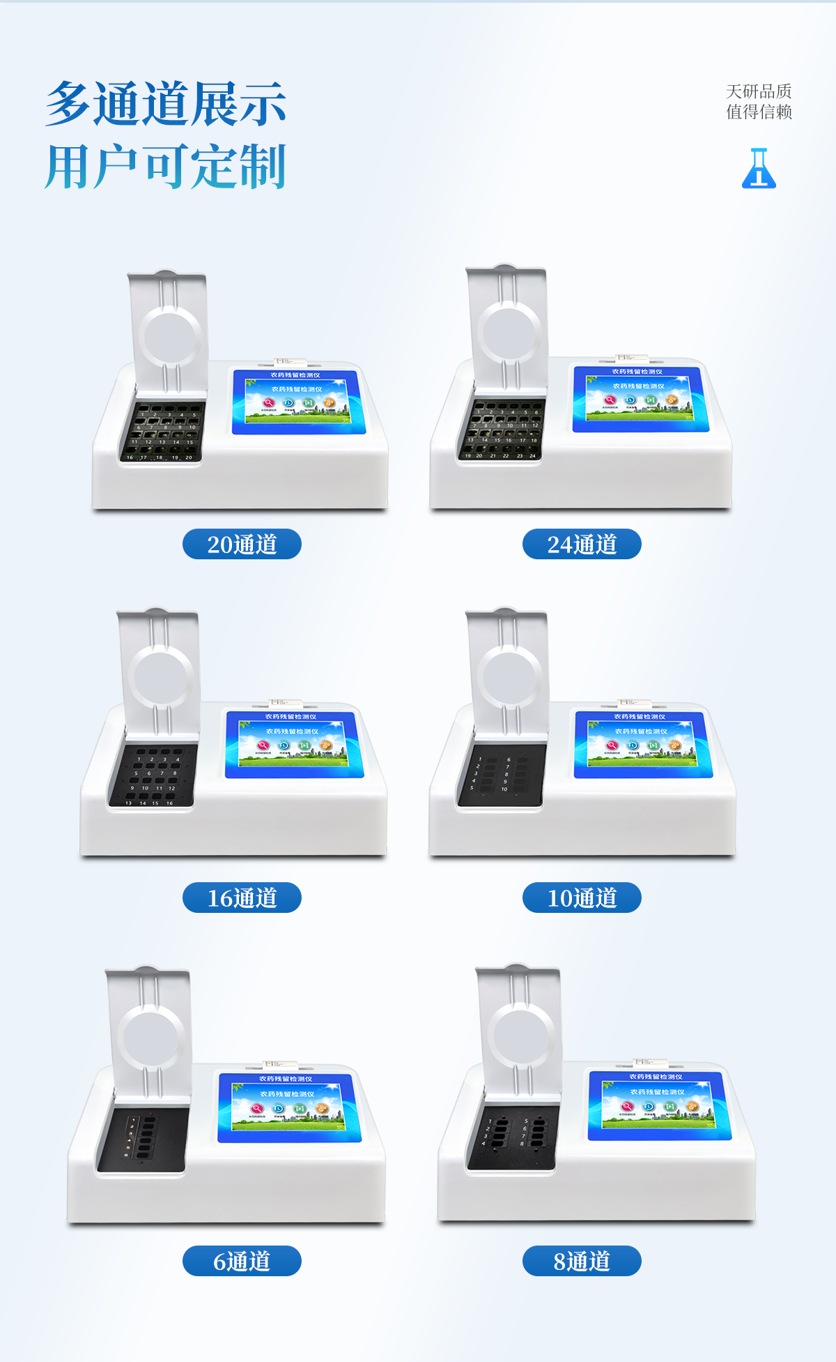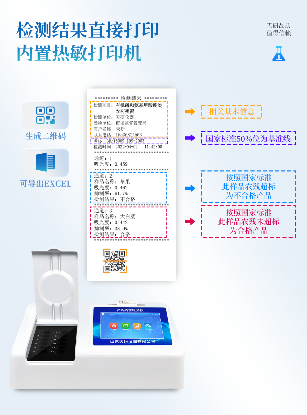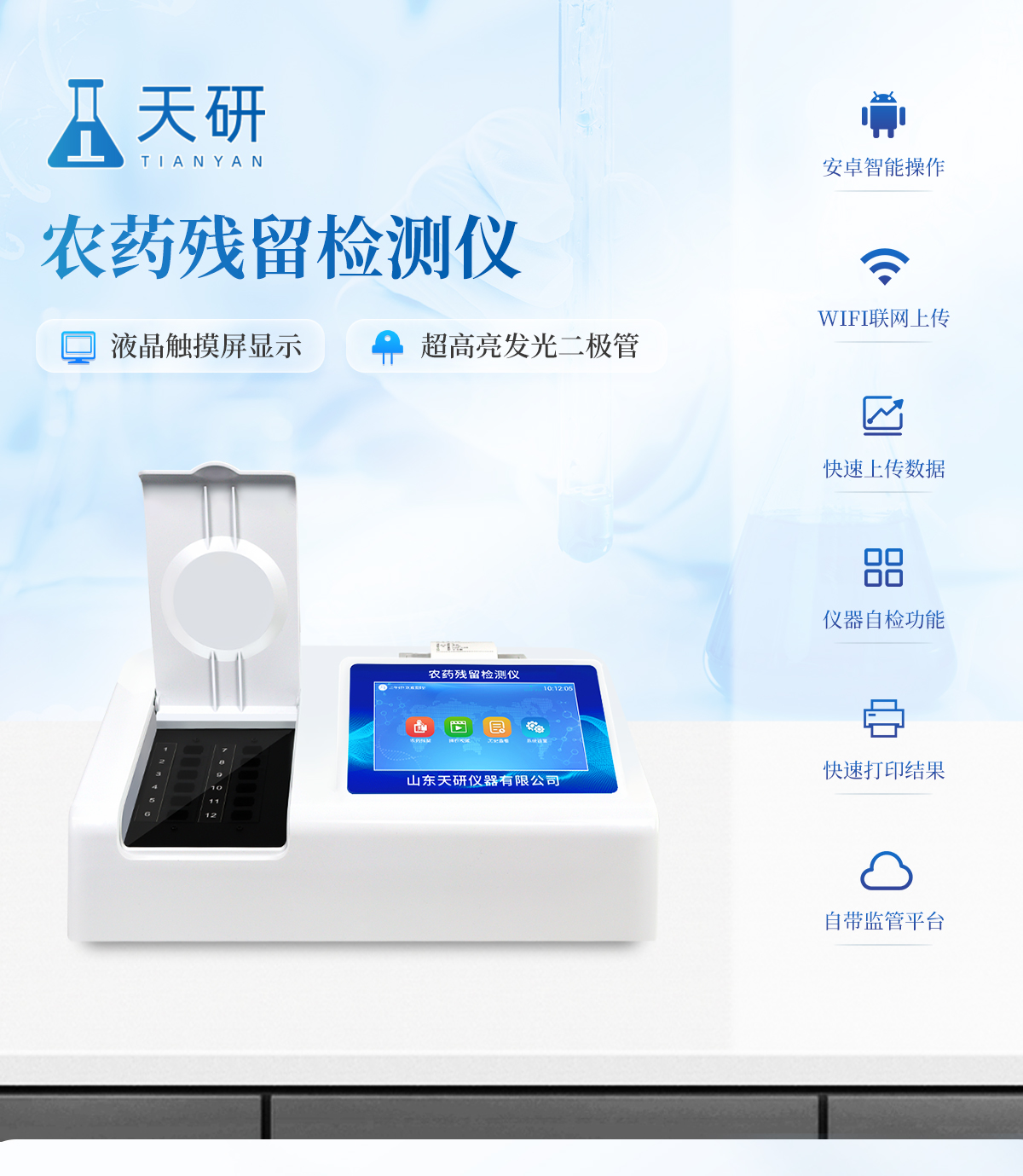 | 乙酰膽堿酯酶和丁酰膽堿酯酶試劑均可以使用,符合國(guó)家標(biāo)準(zhǔn)和農(nóng)業(yè)部標(biāo)準(zhǔn)的要求。 | 自動(dòng)判斷樣品是否合格,檢測(cè)結(jié)果更加直觀。 | 儀器具有100多種蔬菜名稱菜單庫(kù),分類管理,并可按需添加或刪除蔬菜名,編輯蔬菜名稱,可直接打印出蔬菜名稱。 | 檢測(cè)通道:16個(gè)檢測(cè)通道,可以同時(shí)測(cè)試多個(gè)樣品,循環(huán)檢測(cè),即放即檢,每個(gè)樣品由程序控制分別獨(dú)立工作,不會(huì)互相干擾。 | 智能操作系統(tǒng),采用更加人性化操作,主控采用多核處理器,主頻1.88Ghz,運(yùn)轉(zhuǎn)速度更快速,穩(wěn)定性更強(qiáng)。 | 顯示方式:7英寸高靈敏真彩觸摸屏顯示,人性化中文操作界面,讀數(shù)直觀、簡(jiǎn)單。 | 打印機(jī)采用串口5v打印,可選擇手動(dòng)打印或者自動(dòng)打印,三分鐘出打印結(jié)果,打印格式為檢測(cè)人姓名、吸光度差值、檢測(cè)時(shí)間、檢測(cè)機(jī)構(gòu)、樣品名稱及結(jié)果判定。 | 光源采用進(jìn)口超高亮發(fā)光二極管,具有低功耗、高精度、穩(wěn)定性強(qiáng)、光源可控可以關(guān)掉不使用的光源,響應(yīng)速度快等優(yōu)點(diǎn)。 | 智能恒流穩(wěn)壓,光強(qiáng)自動(dòng)校準(zhǔn),長(zhǎng)時(shí)間連續(xù)工作光源無溫漂現(xiàn)象。 | 儀器具有GPRS遠(yuǎn)傳功能,可插手機(jī)卡實(shí)現(xiàn)數(shù)據(jù)遠(yuǎn)傳平臺(tái),wifi聯(lián)網(wǎng)功能,可將數(shù)據(jù)快速上傳電腦,進(jìn)行數(shù)據(jù)管理與統(tǒng)計(jì)。 | 采用USB2.0接口設(shè)計(jì),方便數(shù)據(jù)的存貯和移動(dòng),并可隨時(shí)與計(jì)算機(jī)直接相連,并且可用計(jì)算機(jī)控制儀器。實(shí)現(xiàn)數(shù)據(jù)查詢、瀏覽、分析、統(tǒng)計(jì)、打印等。 | 智能化程度高,儀器具有自檢功能:具有開機(jī)自檢和調(diào)零功能,具有自動(dòng)檢測(cè)重復(fù)性功能 | 儀器具有自身保護(hù)功能,可設(shè)置用戶名及密碼,防止非工作人員操作等。 | 采用DC12v直流供電,安全系統(tǒng)更高,并且配備6A鋰電池充電器。 | 儀器具有重新校準(zhǔn)、鎖定、恢復(fù)出廠設(shè)置功能。 |