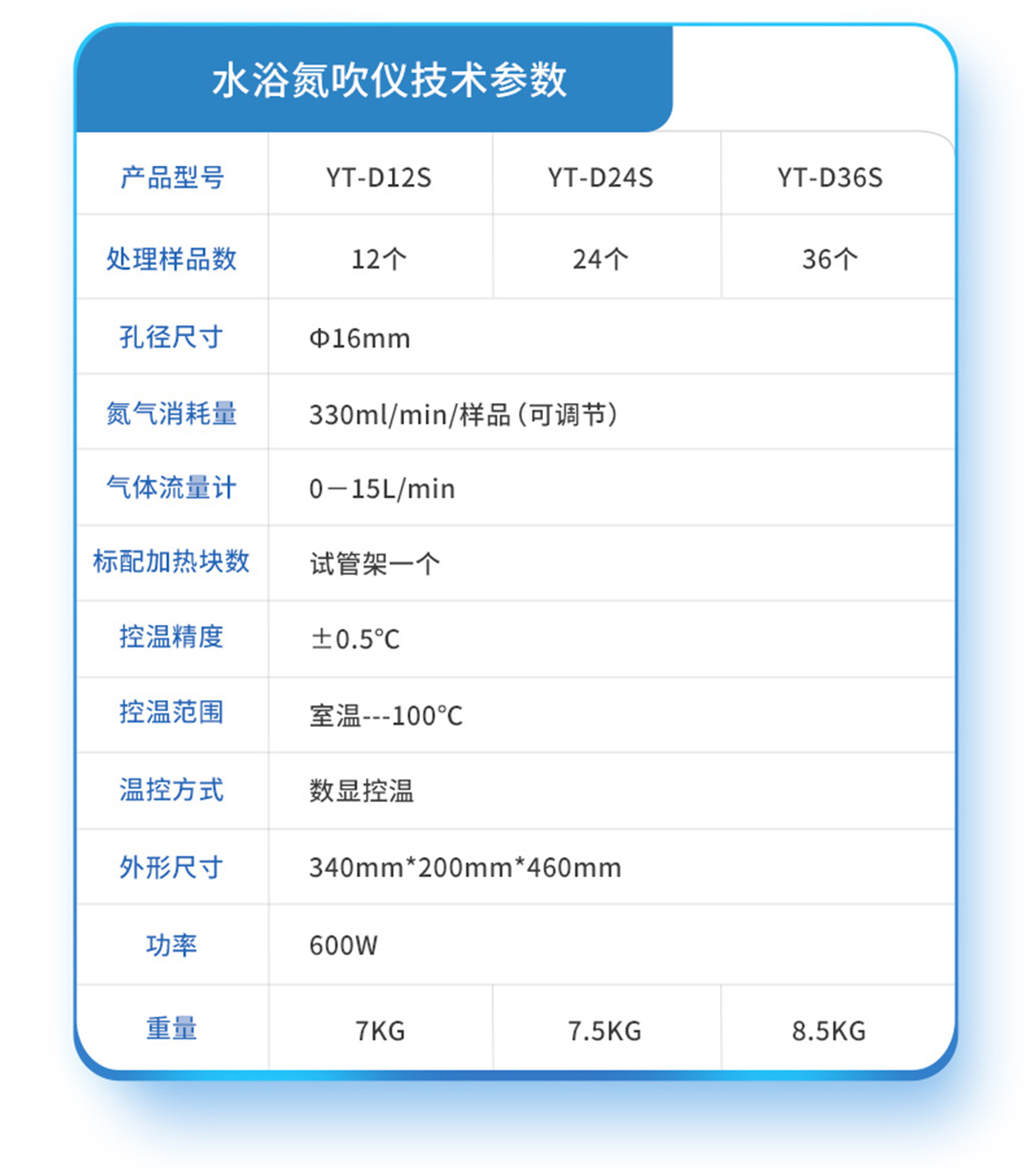 | YT-D36S | 36個(gè) | Ф16mm | 330ml/min/樣品(可調(diào)節(jié)) | 0-15L/min | 試管架一個(gè) | ±0.5℃ | 室溫---100℃ | 數(shù)顯控溫 | 340*200*460 | 600W | 8KG |