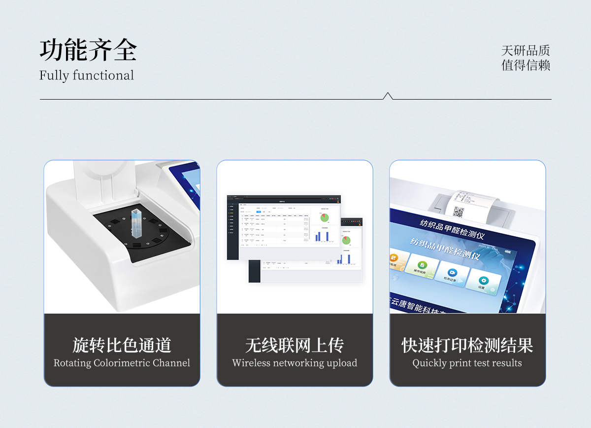 本套紡織品甲醛檢測設備滿足紡織品甲醛含量檢測的中國標準《國家紡織產(chǎn)品基本安全技術規(guī)范》(GB 18401-2010)、《紡織品·甲醛的測定·第1部分:游離和水解的甲醛(水萃取法)》(GB/T 2912.1-2009), 適合各種紡織品、服裝等的甲醛含量檢測。
