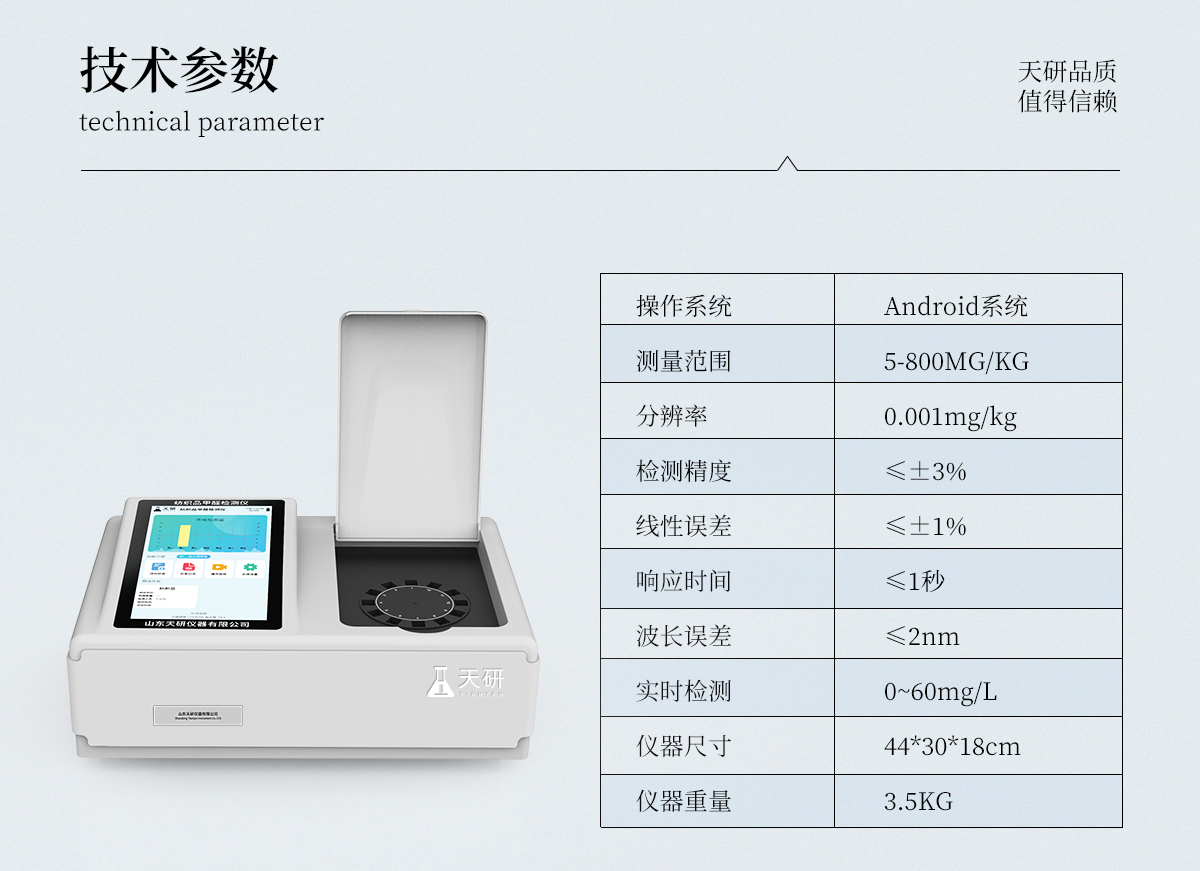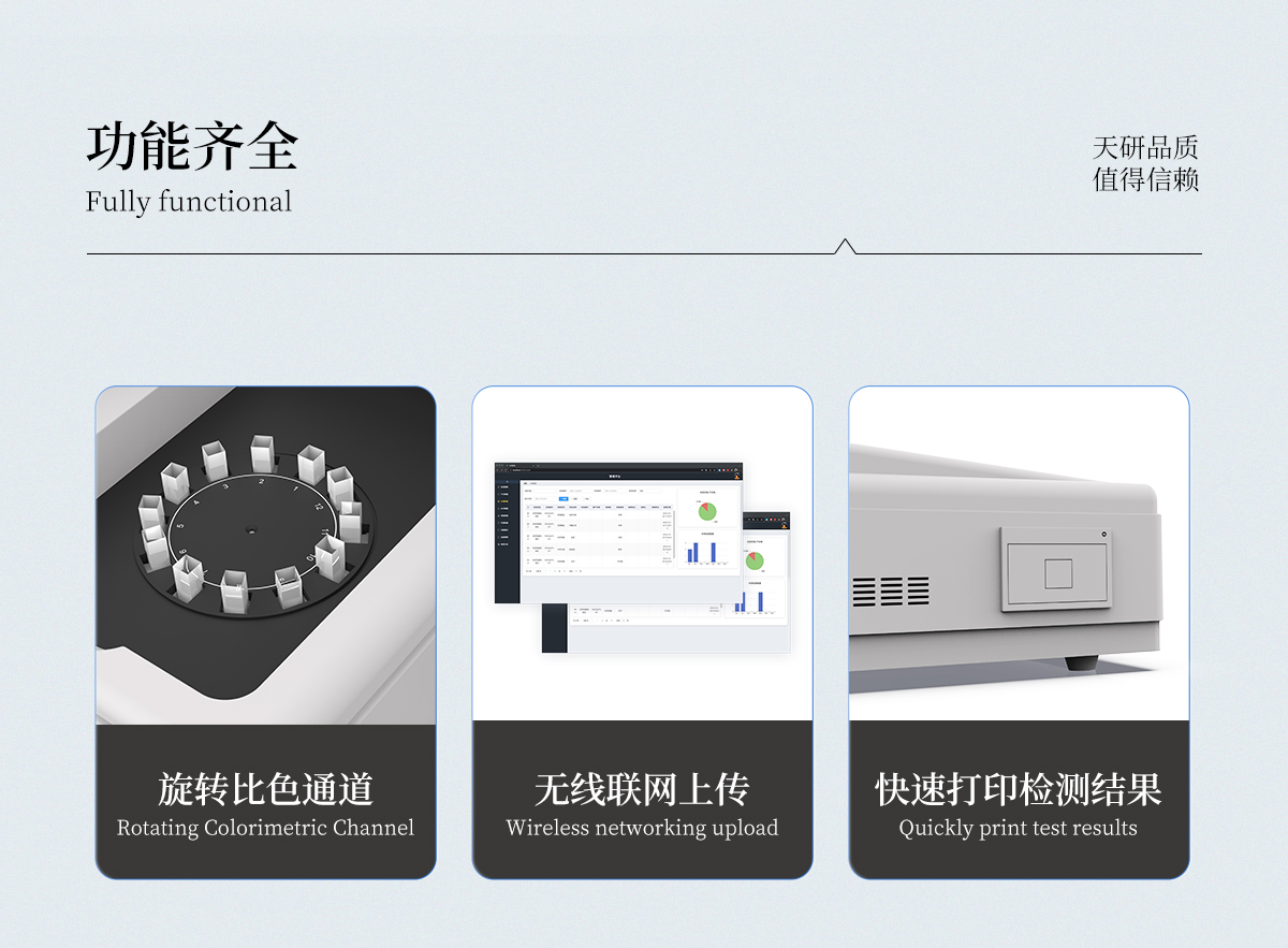 | 1、智能**且方便 | ①智能芯片:主控芯片采用ARM Cortex-A7,RK3288/4核處理器,搭配安卓智能操作系統(tǒng),集實(shí)驗(yàn)操作,分析結(jié)果,打印報(bào)告等功能于一體,使用方便,性能更強(qiáng)。 | ②大屏顯示:采用10.1英寸液晶觸摸屏,單機(jī)即可操作,無需連接外部顯示或控制器。 | ③多樣同檢:儀器具有12個(gè)檢測(cè)通道,可同時(shí)一次性檢測(cè)11個(gè)樣品,效率更高。 | ④工作預(yù)設(shè):具有任務(wù)預(yù)設(shè)模塊,一鍵提前預(yù)設(shè)樣品所有信息內(nèi)容。來樣時(shí)可直接檢測(cè),同時(shí)可多次調(diào)取。 | ⑤數(shù)據(jù)分析:設(shè)備首頁(yè)自動(dòng)匯總分析數(shù)據(jù),并繪制柱形分析圖,各項(xiàng)檢測(cè)數(shù)據(jù)一目了然,快捷直觀。 | ⑥高度集成:模塊高度集合,將分光光度模塊、數(shù)字化管理模塊、無線通訊模塊集成于一體??蓪z測(cè)結(jié)果進(jìn)行分析,直接上傳至數(shù)據(jù)平臺(tái),實(shí)現(xiàn)數(shù)據(jù)共享,方便后期進(jìn)行數(shù)據(jù)分析與統(tǒng)計(jì)。 | ⑦遠(yuǎn)程升級(jí):儀器具備遠(yuǎn)程升級(jí)功能,可遠(yuǎn)程升級(jí)程序,無需返廠,并可持續(xù)性免費(fèi)更新系統(tǒng)版本,降低成本及運(yùn)輸損耗風(fēng)險(xiǎn)。 | 2、檢測(cè)精準(zhǔn)且直觀 | ①**技術(shù):精密旋轉(zhuǎn)比色池,使用同芯片同光源校準(zhǔn)精度,解決不同光源之間存在波長(zhǎng)誤差的問題,更加準(zhǔn)確**。 | ②結(jié)果直觀:儀器自動(dòng)對(duì)檢測(cè)結(jié)果與國(guó)標(biāo)限量值進(jìn)行對(duì)比,自動(dòng)判定結(jié)果是否合格,結(jié)果更直觀。 | 3、功能強(qiáng)大且實(shí)用 | ①存儲(chǔ)功能:設(shè)備可以存儲(chǔ)數(shù)據(jù)100000組,可在屏幕上直觀查看歷史數(shù)據(jù),可導(dǎo)出數(shù)據(jù)。 | ②打印功能:設(shè)備自帶打印功能,可對(duì)樣品信息及檢測(cè)結(jié)果無限次隨意打印。 | ③全新方式:新創(chuàng)自定義打印方式,可按需靈活勾選控制:二維碼,抽樣信息、檢測(cè)信息,受檢信息、復(fù)核信息、抽樣日期、檢測(cè)日期等信息的打印 | ④多重編輯:樣品信息可多重編輯,可以對(duì)每個(gè)通道屬性和樣品信息單獨(dú)進(jìn)行編輯,例如樣品信息、抽樣信息、檢測(cè)信息,受檢信息、復(fù)核信息、抽樣日期、檢測(cè)日期等信息等。 | ⑤雙語設(shè)計(jì):全中文/英文操作菜單,簡(jiǎn)單實(shí)用,適用于不同用戶的需求。 |