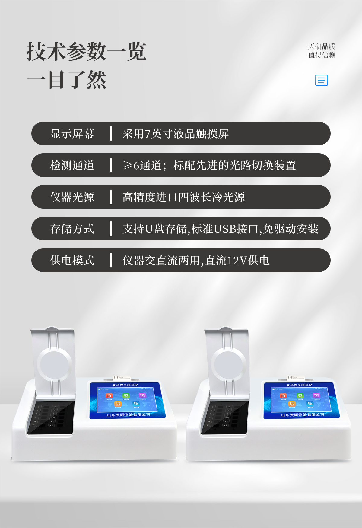 | 安卓智能操作系統(tǒng),采用更加**UI交互界面,儀器具有wifi聯(lián)網(wǎng)上傳、4G聯(lián)網(wǎng)傳輸、GPRS無線遠傳、網(wǎng)線連接功能,快速批量上傳數(shù)據(jù)。 | 智能化程度高,儀器具有自檢功能:具有開機自檢和調(diào)零功能,具有自動檢測重復性功能。 | 新一代高速熱敏打印機,檢測完成可自動打印或批量打印檢測報告和二維碼。 | 儀器帶有監(jiān)管平臺,數(shù)據(jù)可局域網(wǎng)和互聯(lián)網(wǎng)數(shù)據(jù)上傳,檢測結(jié)果直接傳至食品安全監(jiān)管平臺。進行區(qū)域食品安全監(jiān)管及大數(shù)據(jù)分析處理與數(shù)據(jù)統(tǒng)計,檢測區(qū)域食品安全長短期動態(tài),達到食品安全問題預(yù)估、預(yù)警 | 一體化主機,包含光電比色檢測模塊、膠體金免疫層析檢測模塊。 | 一體化便攜式快檢設(shè)備,滿足現(xiàn)場及流動檢測使用需求,能夠在同一軟件下實現(xiàn)所有檢測項目的檢測,并可通過同一窗口直觀顯示檢測結(jié)果。 | 膠體金模塊檢測方式:軌道式自動傳輸掃描,檢測完成后自動退出檢測卡。 | CT線自動識別,無需手動調(diào)整。 | 儀器具有多品類多種類樣品菜單庫,可靈活選擇檢測樣品,不同的檢測通道可同時檢測不同的樣品項目。也可在儀器上直接編輯錄入樣品名稱、檢測指標、送檢單位等信息并保存進樣品數(shù)據(jù)庫。 | 儀器內(nèi)置操作視頻,是您身邊的化驗指導專家。 | 樣品處理簡單省力,整體操作快速、安全、便捷。 | 儀器具有自身保護功能,可設(shè)置用戶名及密碼,防止非工作人員操作等。 | 高靈敏度,高檢測精度,高重復性精度,掃描式高精度光學傳感器。 | 儀器具有重新校準、鎖定、恢復出廠設(shè)置功能。 | 結(jié)果判定線可修改,對照值標定值可保存,斷電不丟失數(shù)據(jù)。 | 兼容市場上所有的膠體金卡,使用耗材不受限制,極大增強用戶使用體驗。 |