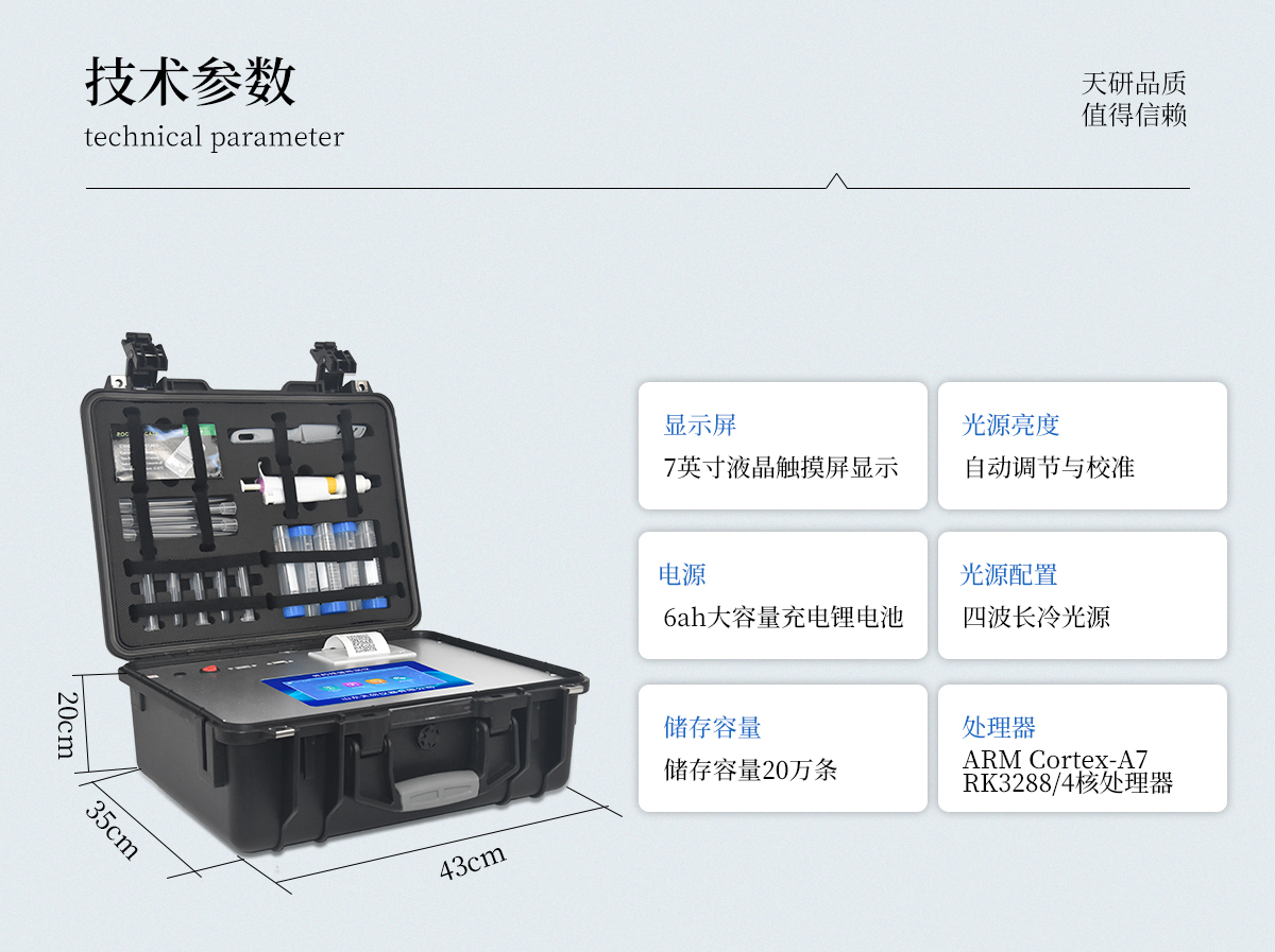 | 主控芯片采用ARM Cortex-A7,RK3288/4核處理器,主頻1.88Ghz,運(yùn)轉(zhuǎn)速度更快速,穩(wěn)定性更強(qiáng)。 | 顯示方式:7英寸液晶觸摸屏顯示,人性化中文操作界面,讀數(shù)直觀、簡(jiǎn)單。 | 交直流兩用,直流12V供電,可連接車載電源,可配6ah大容量充電鋰電池,方便戶外流動(dòng)測(cè)試。 | 光源亮度自動(dòng)調(diào)節(jié)與校準(zhǔn) | 智能恒流穩(wěn)壓,光強(qiáng)自動(dòng)校準(zhǔn),長(zhǎng)時(shí)間連續(xù)工作光源無(wú)溫漂現(xiàn)象。 | 內(nèi)置新國(guó)家限量標(biāo)準(zhǔn),與所測(cè)結(jié)果進(jìn)行現(xiàn)場(chǎng)比對(duì),并持續(xù)更新標(biāo)準(zhǔn)。 | 不間斷進(jìn)樣,連續(xù)檢測(cè) | 樣本編號(hào)自動(dòng)累加。 | 檢測(cè)項(xiàng)目可擴(kuò)充。 | 檢測(cè)結(jié)果可批量打印,批量上傳。 | 檢測(cè)結(jié)果為Excel表格,連接電腦即可拷貝。 | 檢測(cè)結(jié)果存儲(chǔ)容量20萬(wàn)條 | 標(biāo)準(zhǔn)USB接口,免驅(qū)動(dòng)安裝。 | 固件可升級(jí) |