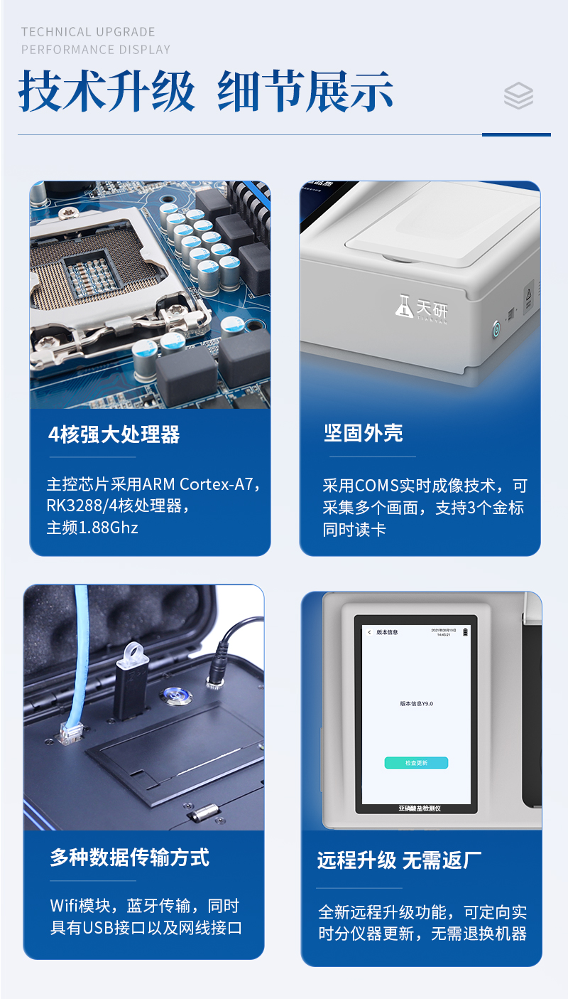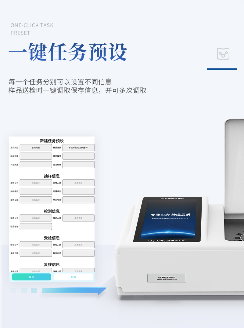 | 儀器采用臺式一體化系統(tǒng)檢測技術,將分光光度模塊、數(shù)字化管理模塊、無線通訊模塊高度集成于一體,可支持檢測60種食品安全檢測項目,同時預留升級檢測方法。 | 儀器檢測模塊標準化、智能化,檢測項目可隨意自由組合。檢測箱體內(nèi)置多個標準檢測單元,檢測模塊可以調(diào)整配置。 | 顯示屏幕:儀器采用10.1英寸豎向液晶觸摸屏顯,搭配運行安卓智能操作系統(tǒng),主控芯片采用ARM Cortex-A7,RK3288/4核處理器,主頻1.88Ghz,操作方便,性能更強。 | 檢測通道:≥12通道;采用精密旋轉(zhuǎn)比色池設計,使用同芯片同光源校準精度,解決不同光源之間的誤差值,更加準確**。(1-12通道間誤差0.1%,**號:ZL202022821055.2) | 儀器光源:高精度進口四波長冷光源,每個通道均配置 410、520、590、630nm 波長光源,標配**的光路切換裝置,**光路切換功能可實現(xiàn)64波長,并且所有檢測項目可實現(xiàn)所有通道同時檢測。 | 設備可一鍵校準,自動保存校準數(shù)據(jù),自動對比校驗,得到精準光源,采用Android SP存儲數(shù)據(jù),光源數(shù)據(jù)永不丟失,方便每一次使用。 | 通訊接口:配備無線通信模塊、4G(APN)通訊模塊、藍牙傳輸,同時具有雙USB接口以及RJ45網(wǎng)線接口,可以多方式實現(xiàn)數(shù)據(jù)保存及數(shù)據(jù)傳輸。 | 存儲方式:支持U盤存儲,標準USB接口,免驅(qū)動安裝。檢測結(jié)果存儲容量20萬條以上,可生成Excel表格進行拷貝,并具有登錄保護功能。 | 智能化操作系統(tǒng): | 1、操作系統(tǒng):儀器可在同一檢測界面自動對應相關檢測通道,一次性選擇1-12個樣品名稱,無需退出界面,節(jié)省操作時間。并可以對每個通道屬性和樣品信息單獨進行編輯,例如送檢單位、人員,檢測人員等,打印時勾選打印顯示。 | 2、數(shù)據(jù)集成系統(tǒng):設備首頁自動匯總分析檢測數(shù)據(jù),包含:周檢測數(shù)據(jù)、月檢測數(shù)據(jù),全部檢測總數(shù)量,均包含檢測總數(shù),合格數(shù),不合格數(shù),以及相關柱形分析圖,各項檢測數(shù)據(jù)一目了然,無需電腦查詢,更加快捷直觀。 | 3、數(shù)據(jù)庫系統(tǒng):十幾項數(shù)據(jù)庫分類管理儀器:包含項目類型、項目數(shù)據(jù)、檢測數(shù)據(jù)、歷史記錄、國標信息、曲線信息、采樣信息、檢測信息、受檢信息、復核信息、圖表信息、光源校準信息、打印樣式信息、樣品庫信息等等,數(shù)據(jù)庫之間互相協(xié)調(diào)聯(lián)動保證數(shù)據(jù)的真實完整性。同時產(chǎn)品數(shù)據(jù)庫以及歷史檢測記錄支持一鍵檢索功能。 | 4、限量規(guī)判系統(tǒng):具有限量查詢、添加物質(zhì)合規(guī)判定系統(tǒng)。檢測出結(jié)果后,系統(tǒng)自動調(diào)用系統(tǒng)數(shù)據(jù)庫中相關國標進行比對判定,客觀顯示判定結(jié)果是否合格。 | 5、項目預設系統(tǒng):儀器具有任務預設模塊,一鍵提前預設,給出方便快捷的新檢測方案,每一個任務分別可以設置不同的樣品、批次、編號、來源、備注、抽樣信息、檢測信息、受檢信息、復核信息等更多信息。樣品送檢時一鍵調(diào)取保存信息,并可多次調(diào)取,大大提高檢測效率。 | 6、數(shù)據(jù)監(jiān)管系統(tǒng):同步對接監(jiān)管平臺,數(shù)據(jù)可局域網(wǎng)和互聯(lián)網(wǎng)數(shù)據(jù)上傳,檢測結(jié)果可選擇直接傳至食品安全監(jiān)管平臺。進行區(qū)域食品安全監(jiān)管及大數(shù)據(jù)分析處理與數(shù)據(jù)統(tǒng)計,檢測區(qū)域食品安全長短期動態(tài),達到食品安全問題預估、預警。 | 7.1、全新打印系統(tǒng):內(nèi)置全新打印機,新創(chuàng)自定義打印方式,可按需靈活勾選控制:二維碼,抽樣信息、檢測信息,受檢信息、復核信息、抽樣日期、檢測日期等信息的打印。 | 7.2、A4紙版本報告打印功能(可選配):設備擁有兩種結(jié)果展示方式,可以自動生成A4打印模板和小票打印模板兩種樣式,可通過WiFi及網(wǎng)線等方式鏈接外置打印機可進行打印。 | 8.供電模式:儀器交直流兩用,直流12V供電,可連接車載電源,可配6ah大容量充電鋰電池,電量可實時顯示,方便戶外流動測試。 | 9.儀器具備遠程升級功能,可定向分客戶分儀器更新,開機后自動更新,并可持續(xù)性免費更新系統(tǒng)版本,無需像傳統(tǒng)產(chǎn)品返廠更新,節(jié)省時間及人力成本并避免了物流運輸返廠升級導致設備損壞的潛在風險。 |