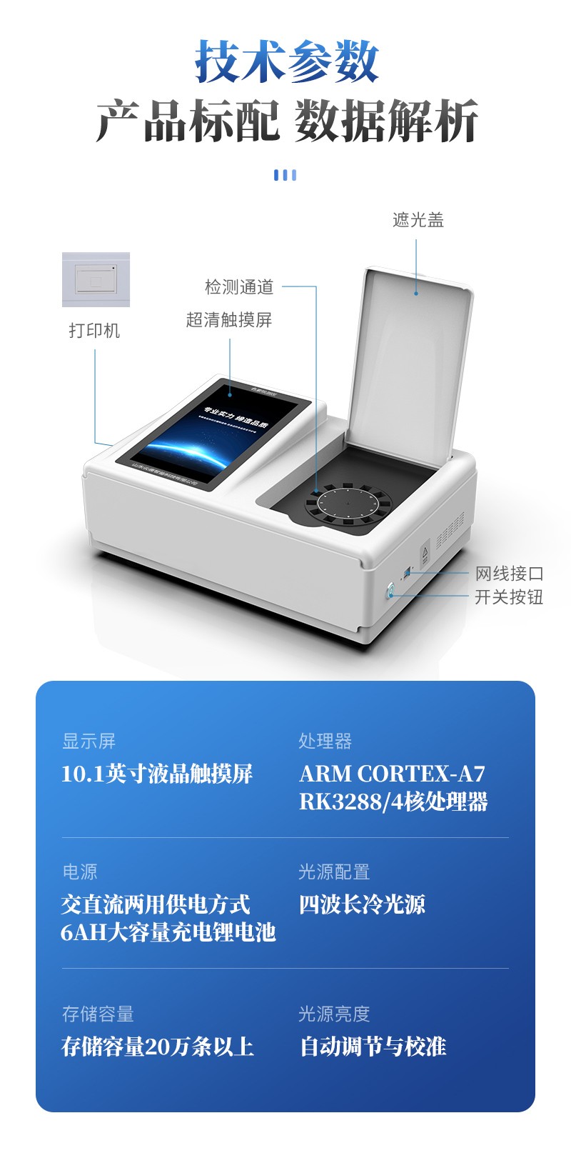 | 儀器采用臺(tái)式一體化系統(tǒng)檢測(cè)技術(shù),將分光光度模塊、新型農(nóng)殘檢測(cè)模塊、數(shù)字化管理模塊、無(wú)線通訊模塊高度集成于一體,支持檢測(cè)200種食品安全檢測(cè)項(xiàng)目,同時(shí)預(yù)留升級(jí)檢測(cè)方法。 | 儀器檢測(cè)模塊標(biāo)準(zhǔn)化、智能化,可隨意自由組合。檢測(cè)箱體內(nèi)置多個(gè)標(biāo)準(zhǔn)檢測(cè)單元,檢測(cè)模塊可以調(diào)整配置。 | 儀器采用全新安卓智能系統(tǒng),主控芯片采用 ARM Cortex-A7,RK3288/4核處理器,10.1寸高清液晶觸摸豎屏,更加**的UI交互界面,運(yùn)轉(zhuǎn)快捷;儀器配備無(wú)線通信模塊: 4G(APN)通訊模塊、Wifi模塊,藍(lán)牙傳輸,同時(shí)具有雙USB接口以及RJ45接口能以多種方式實(shí)現(xiàn)數(shù)據(jù)保存和數(shù)據(jù)傳輸功能。 | 創(chuàng)新檢測(cè)模式: | ★檢測(cè)通道:≥12通道;采用精密旋轉(zhuǎn)比色池設(shè)計(jì),使用同芯片同光源校準(zhǔn)精度,解決不同光源之間的誤差值。1-12通道間誤差0.1%。(**號(hào):ZL202022821055.2) | ★儀器具有自動(dòng)識(shí)別比色皿檢測(cè)功能,即:將樣品比色皿放入儀器后,點(diǎn)擊樣品檢測(cè),儀器自動(dòng)識(shí)別比色皿進(jìn)行通道檢測(cè)。 | 進(jìn)口高精光源: | 高精度進(jìn)口四波長(zhǎng)冷光源,通道配置 410、520、590、630nm 波長(zhǎng)光源,一個(gè)光源芯片驅(qū)動(dòng)一個(gè)光源,誤差極小,每臺(tái)設(shè)備單獨(dú)**校準(zhǔn)光源,**比對(duì),同時(shí)參照四種不同波段光源全方位覆蓋市面上99%的農(nóng)殘食品項(xiàng)目檢測(cè)。 | 智能化操作系統(tǒng): | 便捷操作系統(tǒng):設(shè)備檢測(cè)時(shí)可在同一檢測(cè)界面自動(dòng)對(duì)應(yīng)相關(guān)檢測(cè)通道一次性選擇1-12個(gè)樣品名稱,無(wú)須退出界面,節(jié)省操作時(shí)間。 | 數(shù)據(jù)集成系統(tǒng):設(shè)備首頁(yè)自動(dòng)統(tǒng)計(jì)檢測(cè)數(shù)據(jù)包含:周檢測(cè)數(shù)據(jù)、月檢測(cè)數(shù)據(jù),全部檢測(cè)總數(shù)量,均包含檢測(cè)總數(shù),合格數(shù),不合格數(shù),以及相關(guān)柱形分析圖,對(duì)各項(xiàng)檢測(cè)數(shù)據(jù)清晰掌握,無(wú)需電腦查詢,更加快捷直觀。 | 項(xiàng)目預(yù)設(shè)系統(tǒng):支持添加單個(gè)及多個(gè)相同或不相同的任務(wù)預(yù)設(shè),一鍵快速調(diào)取,每一個(gè)任務(wù)分別可以設(shè)置不同的樣品、批次、編號(hào)、來(lái)源、備注、抽樣信息、檢測(cè)信息、受檢信息、復(fù)核信息等更多信息。無(wú)縫鏈接平臺(tái)和APP實(shí)時(shí)查看下發(fā)任務(wù)。 | 數(shù)據(jù)監(jiān)管系統(tǒng):同步對(duì)接監(jiān)管平臺(tái),數(shù)據(jù)可局域網(wǎng)和互聯(lián)網(wǎng)數(shù)據(jù)上傳,檢測(cè)結(jié)果可選擇直接傳至食品安全監(jiān)管平臺(tái)。集成OSS輸出存儲(chǔ)服務(wù)、區(qū)分設(shè)備定向管理應(yīng)用,進(jìn)行區(qū)域食品安全監(jiān)管及大數(shù)據(jù)分析處理與數(shù)據(jù)統(tǒng)計(jì),檢測(cè)區(qū)域食品安全長(zhǎng)短期動(dòng)態(tài),達(dá)到食品安全問(wèn)題預(yù)估、預(yù)警。 | 自定義打印系統(tǒng):內(nèi)置全新打印系統(tǒng),新創(chuàng)自定義打印方式,可按需靈活設(shè)置開(kāi)啟或關(guān)閉:產(chǎn)品合格證(國(guó)家農(nóng)業(yè)部標(biāo)準(zhǔn)要求),二維碼,抽樣信息、檢測(cè)信息,受檢信息、復(fù)核信息、抽樣日期、檢測(cè)日期等信息的打印。 | 系統(tǒng)遠(yuǎn)程更新功能:可定向分客戶分儀器更新系統(tǒng),按照不同客戶后期實(shí)際需求添加項(xiàng)目,無(wú)需機(jī)器返廠,即可遠(yuǎn)程實(shí)時(shí)升級(jí)全新系統(tǒng),節(jié)省時(shí)間成本及避免運(yùn)輸造成設(shè)備損壞。 | 儀器主機(jī)采用一體化防水、抗壓、防撞擊、防腐蝕箱體設(shè)計(jì),同時(shí)配備交直流供電,可連接車載電源,可選配大容量充電鋰電池,滿足現(xiàn)場(chǎng)野外檢測(cè)需求。 | 安全證書,放心保障:儀器具有中國(guó)計(jì)量科學(xué)研究院校準(zhǔn)證書,**認(rèn)證。 |