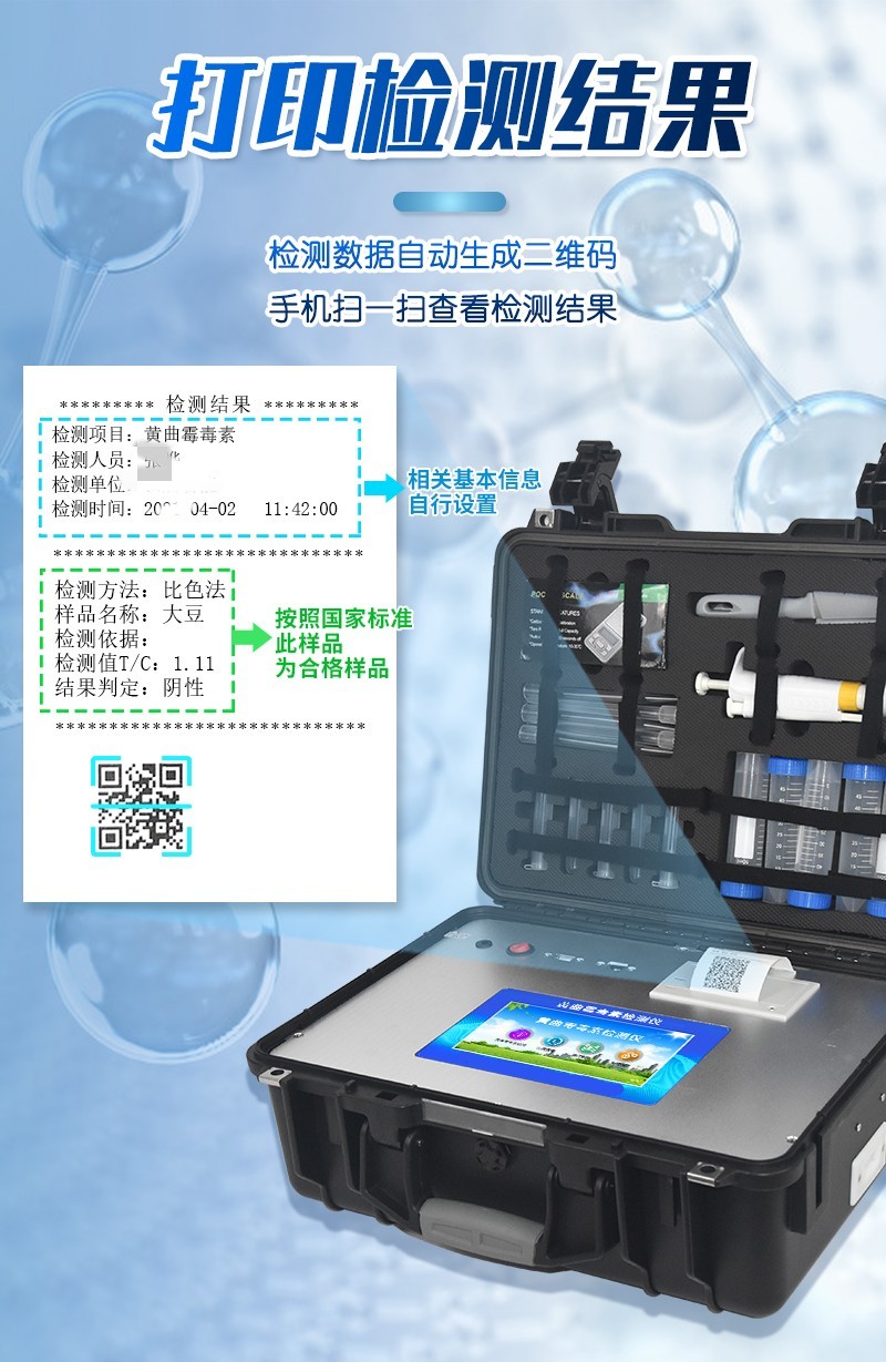 | 工作模式:安卓5.1系統(tǒng)模式 | 軟件支持:安卓軟件平臺(tái) | ☆檢測(cè)項(xiàng)目:可檢測(cè)農(nóng)藥殘留、食品添加劑、色素、可現(xiàn)場(chǎng)快速檢測(cè)農(nóng)藥殘留、鹽酸克倫特羅、沙丁胺醇、萊克多巴胺、四環(huán)素類(lèi)、硝基呋喃類(lèi)、磺胺類(lèi)、沙星類(lèi)、氯霉素、孔雀石綠磺胺類(lèi),并且可以連接食品安全監(jiān)控系統(tǒng)。 | 測(cè)量原理:光電池測(cè)量反射衰減信號(hào)強(qiáng)度; | 測(cè)量速度:≤5s; | 儲(chǔ)存功能:儲(chǔ)存至少20000個(gè)結(jié)果數(shù)據(jù),支持自定義查詢; | 藍(lán)牙模塊:藍(lán)牙4.2 | 檢測(cè)精度:CV值小于1%(標(biāo)準(zhǔn)卡),批間差小于3%(標(biāo)準(zhǔn)卡); | 檢測(cè)輸出:支持色度檢測(cè),CT比值檢測(cè),T線檢測(cè)等多種擬合方式; | 內(nèi)置熱敏打印機(jī) | ☆數(shù)據(jù)輸出:內(nèi)置WIFI,支持無(wú)線數(shù)據(jù)上傳,標(biāo)準(zhǔn)RS232串口,網(wǎng)絡(luò)接口和USB2.0接口; | ☆內(nèi)置食品安全信息系統(tǒng),一鍵數(shù)據(jù)上傳。 | 儀器外形尺寸:300*250*79mm | ☆操作系統(tǒng)配置:7吋液晶屏、4核處理器、1600萬(wàn)像素 | 凈重:2.0kg。 |