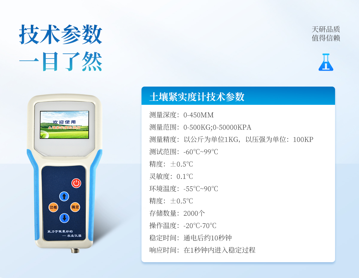 簡(jiǎn)述: 土壤緊實(shí)度測(cè)量?jī)x也被稱作土壤堅(jiān)實(shí)度和硬度測(cè)量?jī)x,可用于野外測(cè)量土壤的緊實(shí)度。緊實(shí)的土壤可阻止水分的入滲,降低化肥的利用率,影響植物根系生長(zhǎng),導(dǎo)致作物減產(chǎn)。因此,得知土壤的緊實(shí)度顯得尤為重要,此儀器可以更好的指導(dǎo)農(nóng)業(yè)生產(chǎn)和公路建設(shè)。 技術(shù)參數(shù):