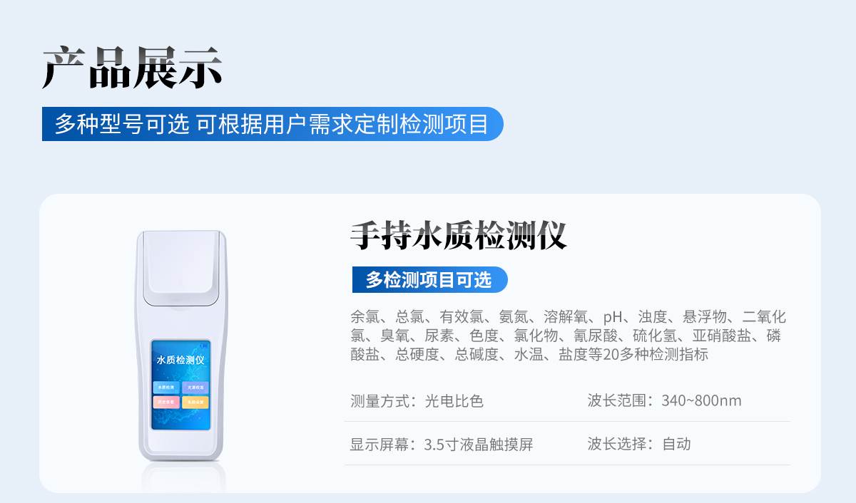 適用于純凈水廠、自來水廠、生活污水處理廠、工業(yè)污水、水產(chǎn)養(yǎng)殖、河流監(jiān)測、游泳場館、水源保護(hù)、生產(chǎn)監(jiān)測、科研實(shí)驗(yàn)等。