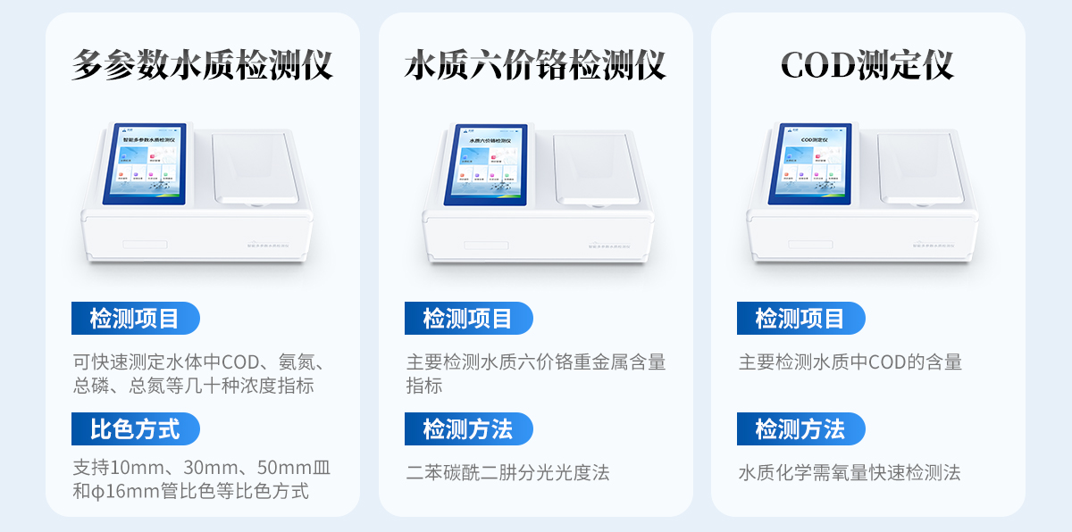提取一定量水體樣品,經(jīng)過前處理后根據(jù)不同檢測項(xiàng)目按照試劑說明書滴入檢測試劑,檢測試劑會與水體中的待測物質(zhì)發(fā)生反應(yīng),反應(yīng)液呈現(xiàn)特定的顏色。