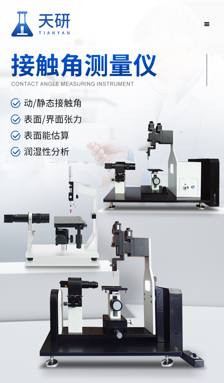 本機用于測試和分析液體在固體表面的接觸角、液體的表面張力、固體的表面能等。實現(xiàn)對固體表面的親/疏水性分析、潤濕性分析、潔凈度檢測、處理工藝效果評估,以及液體被競爭、吸附、吸收和鋪展等過程分析。廣泛應用于化工、醫(yī)藥、食品、電子、印染、噴涂、軍工和科教等眾多領域的測試與研究。