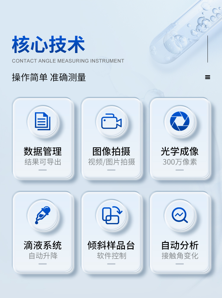 功能概述: 本機用于測試和分析液體在固體表面的接觸角、液體的表面張力、固體的表面能等。實現(xiàn)對固體表面的親/疏水性分析、潤濕性分析、潔凈度檢測、處理工藝效果評估,以及液體被競爭、吸附、吸收和鋪展等過程分析。廣泛應用于化工、醫(yī)藥、食品、電子、印染、噴涂、軍工和科教等眾多領域的測試與研究。