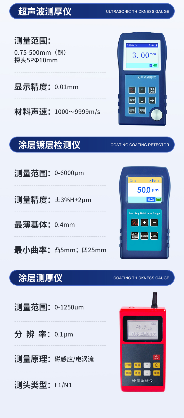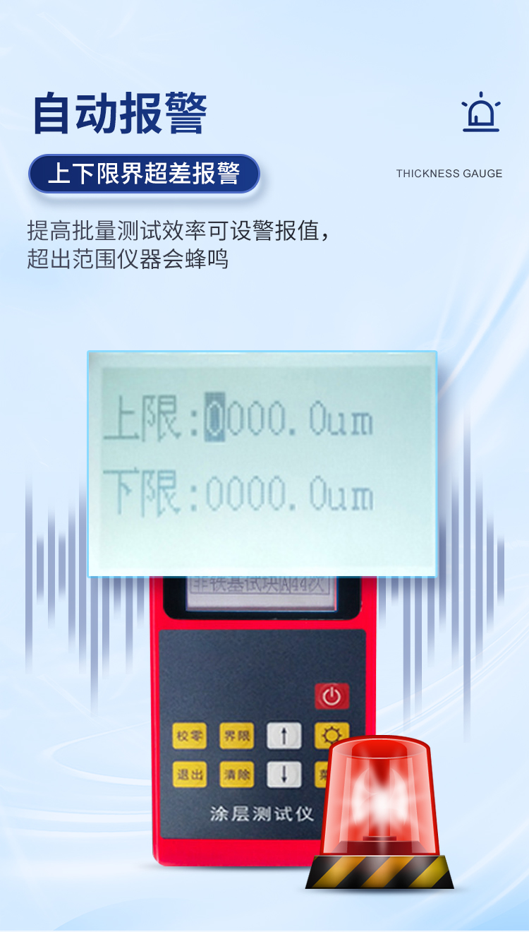 產(chǎn)品簡(jiǎn)介: 涂鍍層測(cè)厚儀是一款測(cè)量磁性金屬材料表面涂鍍層覆蓋層物體厚度的專業(yè)無(wú)損檢測(cè)儀器。采用磁性測(cè)厚方法,可無(wú)損地測(cè)量磁性金屬基體(如:鋼、鐵)上非磁性覆層的厚度(鍍鋅、鉻、錮、琺瑯、橡膠、粉末、油漆、電泳、搪瓷、噴塑、涂料、防腐防火涂層等),本儀器結(jié)構(gòu)精密牢固,重復(fù)性好,性能猶佳