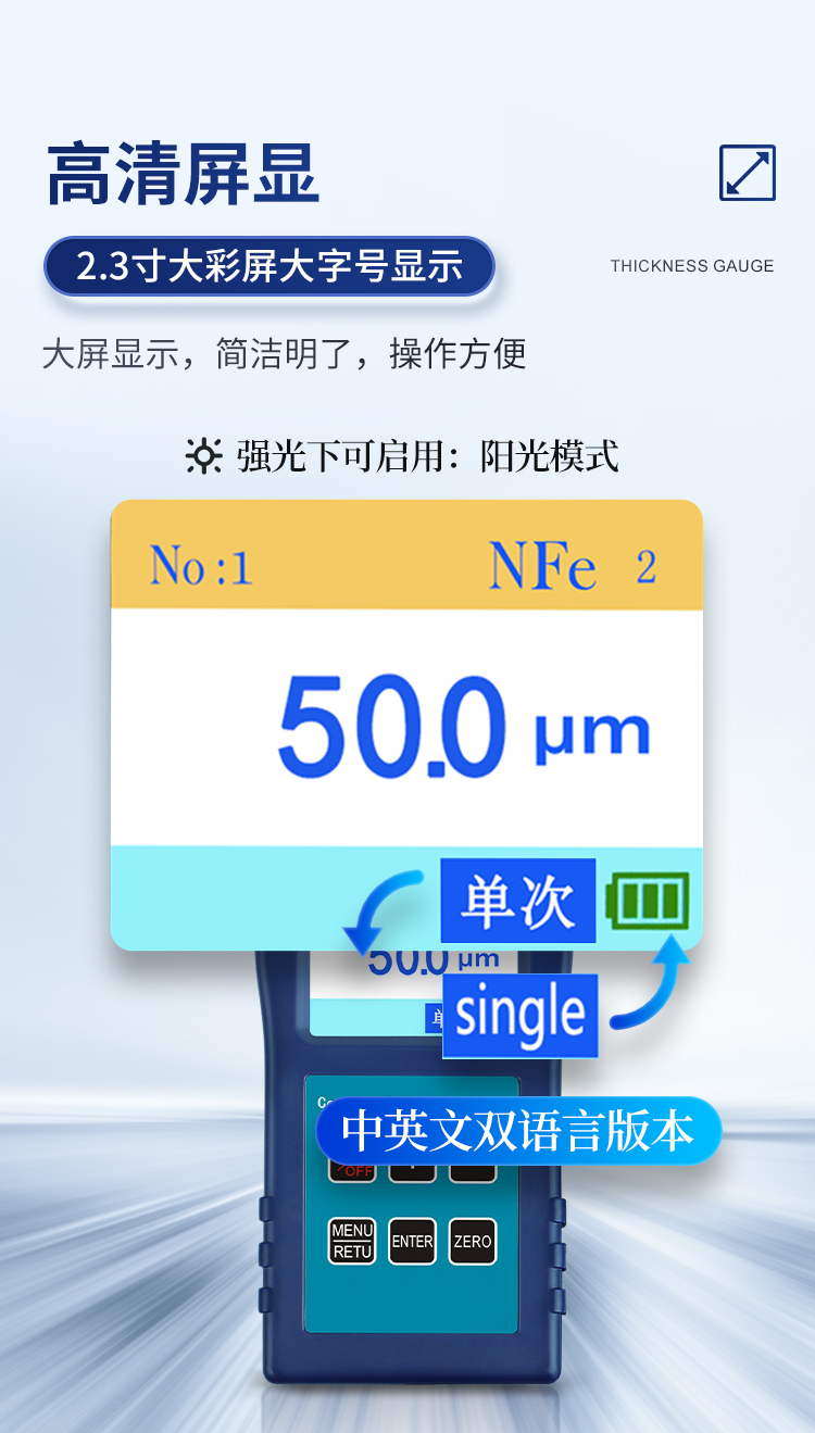 | l 操作簡(jiǎn)單,測(cè)試速度快,靈敏度好,測(cè)量精度高 | l 采用合金探頭,堅(jiān)硬耐用,精準(zhǔn) | l 具有兩種測(cè)量方式:連續(xù)測(cè)量和單次測(cè)量 | l 設(shè)有四個(gè)統(tǒng)計(jì)功能:**值(MAX)、*小值(MIN)、平均值(MEA)、測(cè)量次數(shù)(No) | l 大容量存儲(chǔ),可分10組存儲(chǔ),每組200個(gè),共可存貯2000個(gè)數(shù)據(jù) | l 存儲(chǔ)數(shù)據(jù)存看刪除功能 | l 三種校準(zhǔn)方式:零點(diǎn)校準(zhǔn)、兩點(diǎn)校準(zhǔn)、多點(diǎn)校準(zhǔn) | l 上下限報(bào)警功能(單次測(cè)量模式下可設(shè)置) | l 操作過(guò)程有蜂鳴聲標(biāo)示(單次測(cè)量模式下) | l 自動(dòng)識(shí)別鐵基和非鐵基底材 | l 公英制轉(zhuǎn)換μm/Mil | l 陽(yáng)光模式(強(qiáng)光下使用) | l 中英文雙語(yǔ)言版本 | l 2.3寸大彩屏大字號(hào)顯示 | l 手動(dòng)/自動(dòng)關(guān)機(jī)功能 |