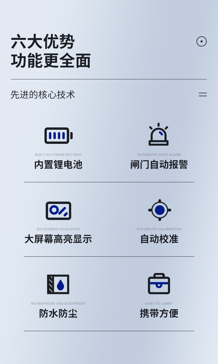 | 高精良定量、定位,適合較近和較遠(yuǎn)距離探傷的要求; | 近場盲區(qū)小,適合小管徑、薄壁管探傷的要求; | 自動校準(zhǔn):一鍵式自動校準(zhǔn),操作便捷,自動測試探頭的“零點”、“K值”、“前沿”及材料的“聲速”; | 自動顯示缺陷回波位置(深度d、水平p、距離s、波幅、當(dāng)量dB、孔徑ф值); | 自由切換三種標(biāo)尺(深度d、水平p、距離s); | 自動增益、回波包絡(luò)、峰值記憶功能提高了探傷效率; | φ值計算:直探頭鍛件探傷,找準(zhǔn)缺陷**波自動換算孔徑ф值,大平底自動計算; | 100個單獨探傷通道(可擴展),可自由輸入并存儲任意行業(yè)的探傷標(biāo)準(zhǔn),現(xiàn)場探傷無需攜帶試塊; | 可自由存儲、回放500幅A掃波形及數(shù)據(jù); | DAC、AVG自動生成并可以分段制作,取樣點不受限制,并可進(jìn)行修正與補償; | 13個內(nèi)置探傷標(biāo)準(zhǔn)可調(diào)出; | 可以自由輸入任意行業(yè)標(biāo)準(zhǔn); | 發(fā)射脈沖寬度和強度可調(diào); | 與計算機通訊,實現(xiàn)計算機數(shù)據(jù)管理,并可導(dǎo)出Excel格式、A4紙張的探傷報告; | IP65標(biāo)準(zhǔn)鋁鎂合金外殼,堅固磨損低,防水防塵,抗干擾能力好; | 26萬色真彩屏超高亮顯示,亮度可調(diào),適合強光、弱光的工作環(huán)境; | 性能安全環(huán)保鋰電池供電,可連續(xù)工作10小時。 | 實時時鐘記錄:實時探傷日期、時間的跟蹤記錄,并存儲; | 掉電保護(hù),存儲數(shù)據(jù)不丟失; | 探傷參數(shù)可自動測試或預(yù)置; | 數(shù)字抑制,不影響增益和線性; | 增益補償:對表面粗糙度、曲面、厚工件遠(yuǎn)距離探傷等因素造成的Db衰減可進(jìn)行修正。 | 真正的三防設(shè)計,可以保障用戶在復(fù)雜的現(xiàn)場和野外不受雨水、油污、粉塵等的侵蝕,讓探傷儀的使用壽命大大延長 |