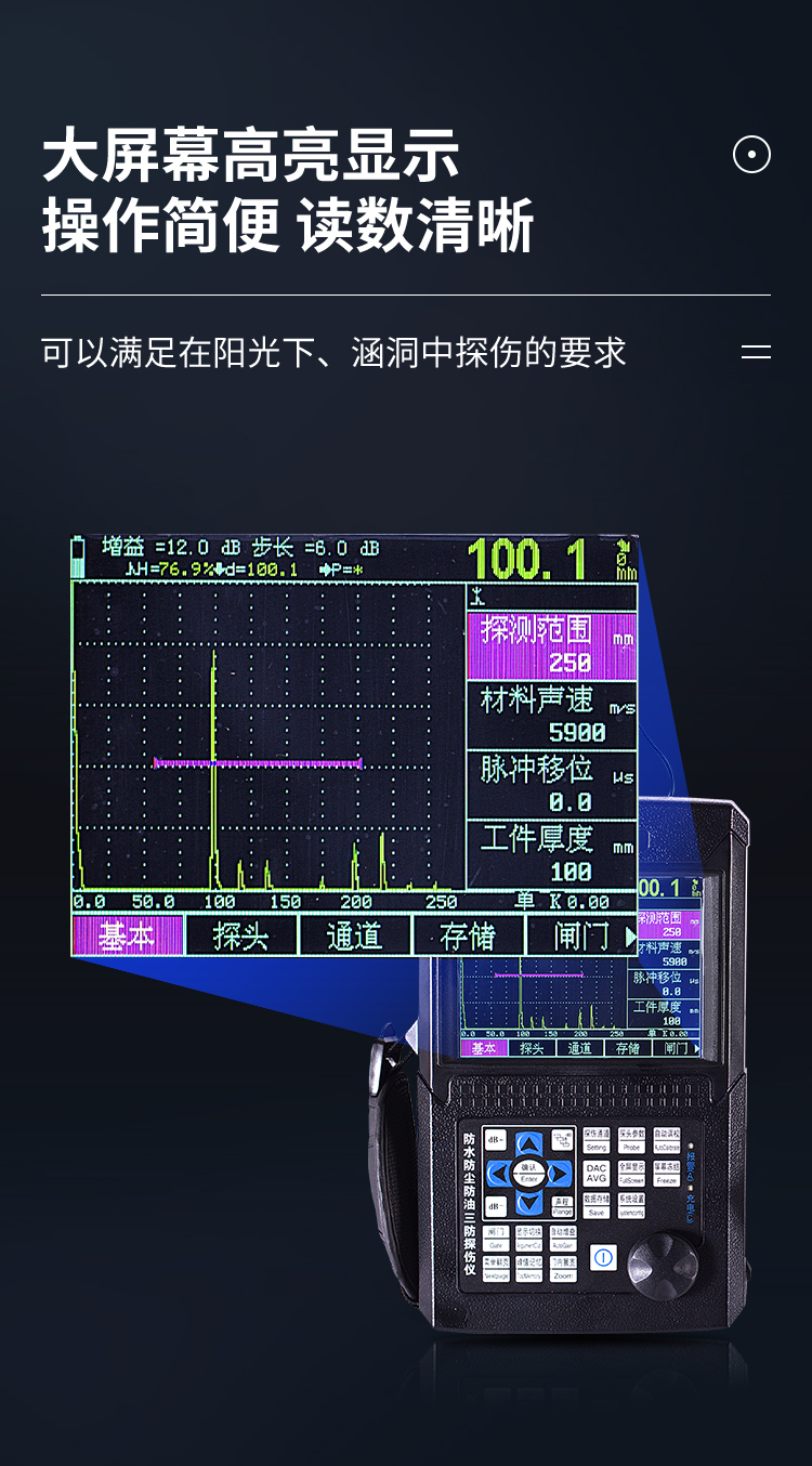 | 按鍵簡潔,操作簡單; | 大屏幕高亮顯示,可以滿足在陽光下、涵洞中探傷的要求。 |