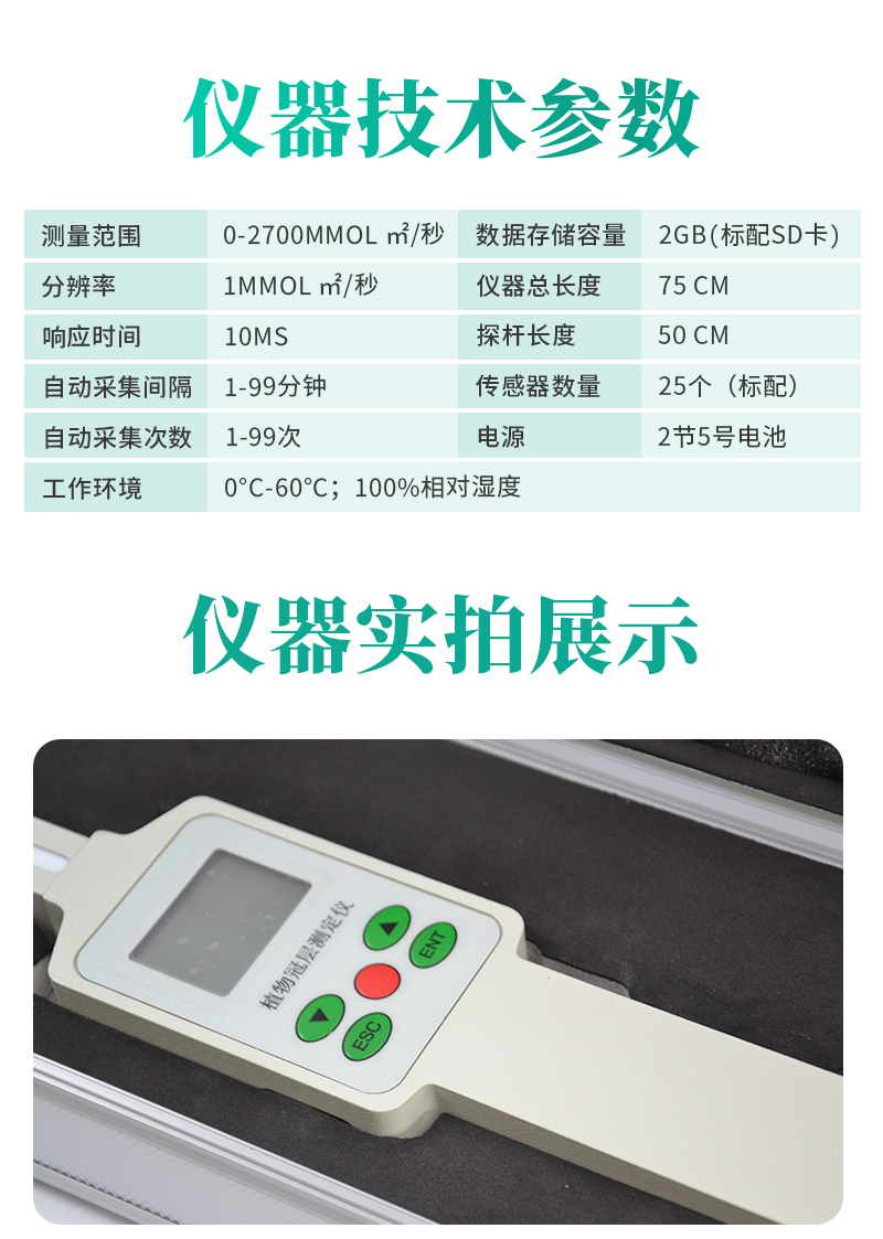 | 鏡頭角度:150° | 分辨率:768×494pix | 測(cè)量范圍:天頂角由0°~75°(150°魚眼鏡頭)可分割成十個(gè)區(qū)域,方位角360°亦可分割成十個(gè)區(qū)域 | PAR感應(yīng)范圍:感應(yīng)光譜400nm~700nm | 測(cè)量范圍0~2000μmol/㎡?S | 分析軟件:植物冠層分析系統(tǒng) | 電 源:8.4v可充電鋰電池組 | 探頭尺寸:直徑6cm,高10cm | 總 重 量:500克(不含筆記本電腦) | 傳輸接口:USB | 工作溫度:0~55℃ |