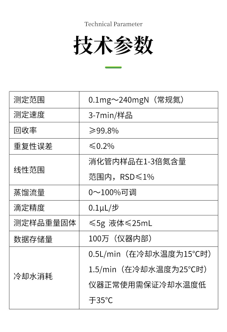 | 1.測定范圍:0.1mg~240mgN(常規(guī)氮) | 2.測定速度:3-7min/樣品 | 3.☆回收率:≥99.8% | 4.☆重復(fù)性誤差:≤0.2% | 5.線性范圍:消化管內(nèi)樣品在1-3倍氮含量范圍內(nèi),RSD≤1% | 6.蒸餾流量:0~100%可調(diào) | 7.☆滴定精度:0.1μL/步 | 8.測定樣品重量固體:≤6g 液體≤25mL | 9.☆數(shù)據(jù)存儲量:100萬(儀器內(nèi)部) | 10.☆500組用戶自定義方案 | 11.冷卻水消耗:0.5L/min(在冷卻水溫度為15℃時),1.5/min(在冷卻水溫度為25℃時);儀器正常使用需保證冷卻水溫度低于35℃。 |