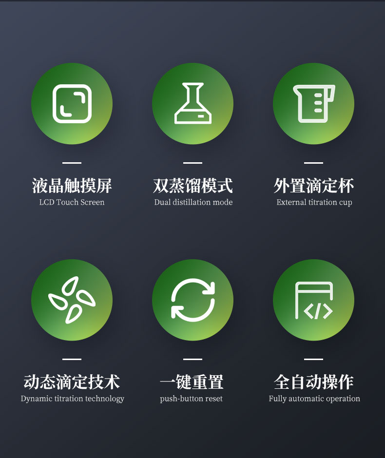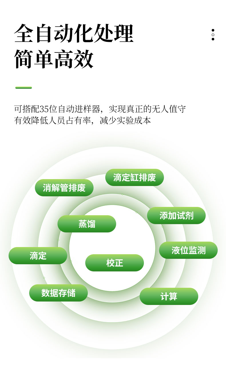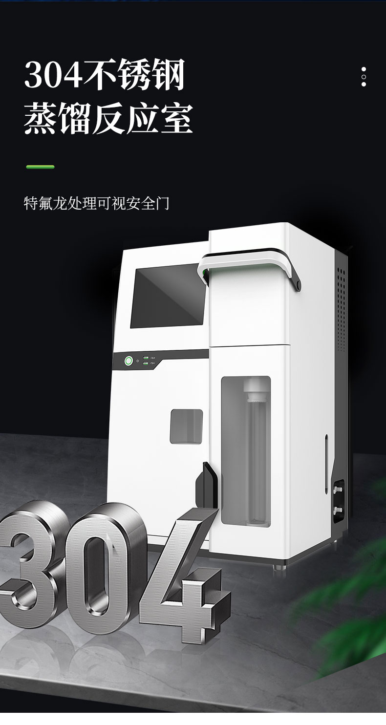| 1.采用國家標(biāo)準(zhǔn)的凱氏定氮方法:濃硫酸環(huán)境消解樣品、堿性環(huán)境蒸汽蒸餾、硼酸吸收、指示劑滴定終點顏色判斷法。參與國家標(biāo)準(zhǔn)GB/T22923-2008、官方JJF109-2012《定氮儀校準(zhǔn)規(guī)范》的起草; | 2.☆全自動添加試劑、蒸餾、滴定、消解管排廢、滴定缸排廢、校正、液位監(jiān)測、計算、數(shù)據(jù)存儲、生成測試報告并上傳,整個實驗過程全自動化處理簡單**; | 3.全自動安全監(jiān)測:安全門、消化管到位監(jiān)測;蒸餾發(fā)生器具有壓力傳感器、蒸汽過壓保護(hù)、溫度傳感器、溫度保護(hù)開關(guān)、水位浮球與電位雙重檢測等多重保護(hù);蒸餾餾出液溫度和體積監(jiān)測,避免溫度過高或蒸餾體積波動影響測試結(jié)果;冷卻水流量實時監(jiān)測,低水壓報警,停水自動終止運行;冷凝流出液溫度監(jiān)測,保障樣品完全冷凝,確保實驗結(jié)果準(zhǔn)確可靠; | 4.☆可搭配35位自動進(jìn)樣器,實現(xiàn)真正的無人值守,有效降低人員占有率,減少實驗成本; | 5.全新的多核ARM操作系統(tǒng),中英文操作界面可選,10英寸LED高清彩色液晶觸摸屏實時監(jiān)測和顯示實驗過程; | 6.☆四級權(quán)限分級功能,從程序管理員-主管理員-輔助管理員-操作員使用不同權(quán)限,內(nèi)置時間鎖數(shù)據(jù)鎖符合“GLP和GMP”規(guī)定; | 7.☆上位機(jī)采用windows操作軟件,具有測試數(shù)據(jù)、回收率計算及統(tǒng)計、測試報告自動生成等功能,可方便用戶通過PC機(jī)對數(shù)據(jù)進(jìn)行分析、處理;數(shù)據(jù)處理軟件包具有數(shù)據(jù)跟蹤、審核、輸出功能,具有操作、審核、批準(zhǔn)、管理、維護(hù)五級管理功能,測試信息可靠、可溯源; | 8.☆可通過USB2.0接口使用U盤輸出數(shù)據(jù);儀器內(nèi)置WIFI模塊,網(wǎng)絡(luò)自動識別,可通過無線通訊,將詳細(xì)的測試信息同步上傳至PC端處理; | 9.雙蒸餾模式,蒸汽流量0~100%任意可調(diào); | 10.外置滴定杯,實驗過程實時可見,滴定系統(tǒng)照明配置與成熟的顏色終點判定軟件配合,使外界光源的影響降至**; | 11.高精度滴定系統(tǒng),專業(yè)一體式精工柱塞,確保測試精度和使用的可靠性; | 12.☆滴定系統(tǒng)采用動態(tài)滴定技術(shù),可實現(xiàn)邊蒸餾邊滴定和滴定系統(tǒng)自動判斷和切換滴定速度,真正達(dá)到蒸餾、滴定、計算過程同步完成,減少實驗時間40%; | 13.滴定顏色可自動與手動校準(zhǔn)。滴定終點判定采用高精度的十六位三基色數(shù)字信號顏色傳感器采集顏色信號; | 14.☆儀器內(nèi)部可儲存100萬組數(shù)據(jù),云端可無限量儲存數(shù)據(jù)。測試結(jié)果可選擇包含Word、Excel等12種表示方式; | 15.耐強(qiáng)酸耐強(qiáng)堿液腐蝕隔膜試劑泵,超強(qiáng)的耐顆粒堵塞結(jié)構(gòu),加液穩(wěn)定,負(fù)壓抽吸無危險; | 16.☆防濺瓶采用高分子材質(zhì),耐高溫、強(qiáng)堿,同時保證氨氣不泄露,回收率不偏低; | 17.試劑桶液位監(jiān)測,保證實驗過程不出現(xiàn)缺液問題。 | 18.儀器具備自檢功能、具備一鍵重置。 | 19.標(biāo)配2種工作模式根據(jù)需求可增配硝態(tài)氮、高氮自動測試模塊。 | 20.☆304不銹鋼蒸餾反應(yīng)室,特氟龍?zhí)幚砜梢暟踩T。 | 21.貼合氨逸出規(guī)律特殊設(shè)計的蒸餾系統(tǒng),確保高可靠的測試回收率 | 22.儀器內(nèi)置操作助手儀器更智能化。 |