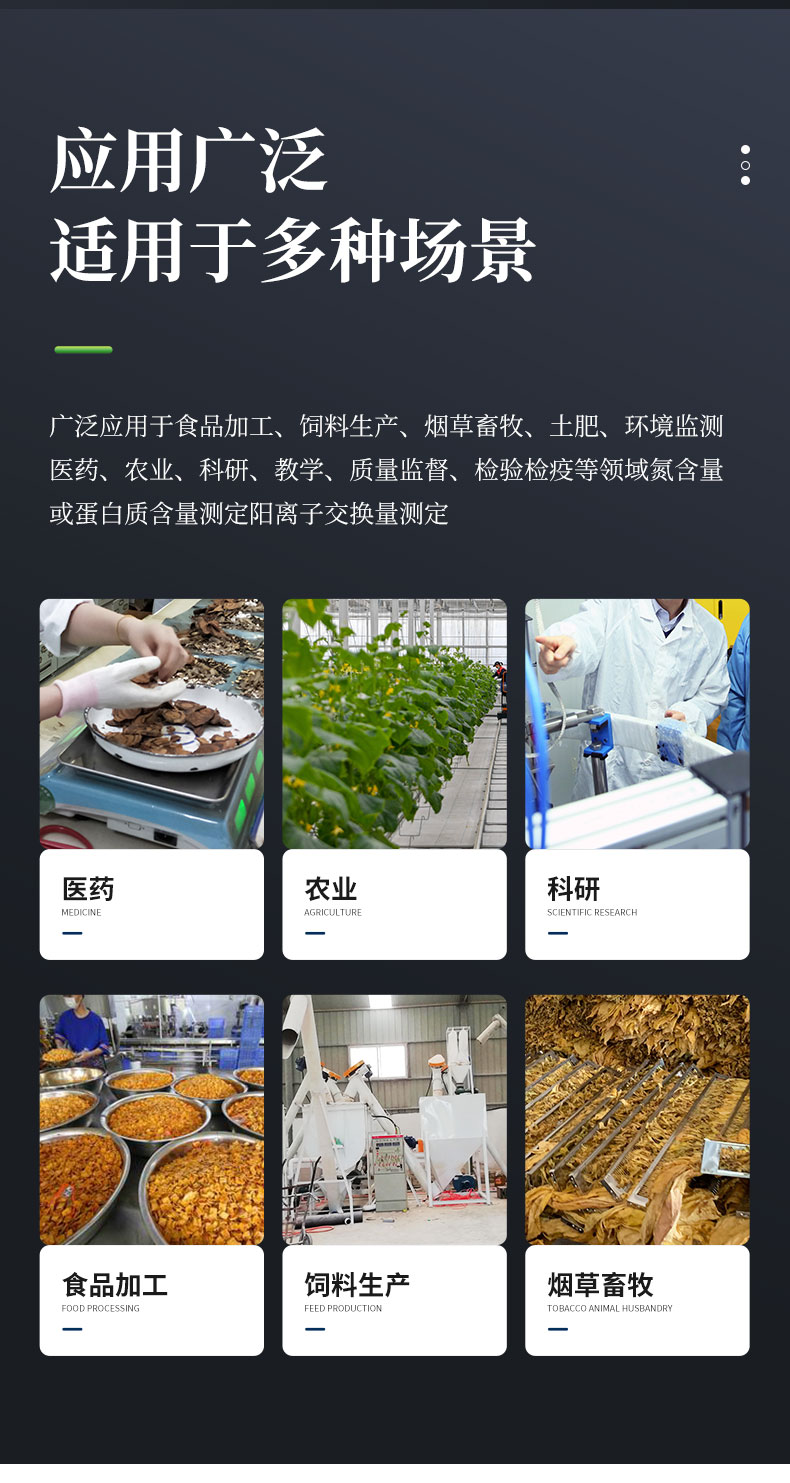 1.廣泛應(yīng)用于食品加工、飼料生產(chǎn)、煙草畜牧、土肥、環(huán)境監(jiān)測、醫(yī)藥、農(nóng)業(yè)、科研、教學(xué)、質(zhì)量監(jiān)督、檢驗檢疫等領(lǐng)域氮含量或蛋白質(zhì)含量測定陽離子交換量測定。