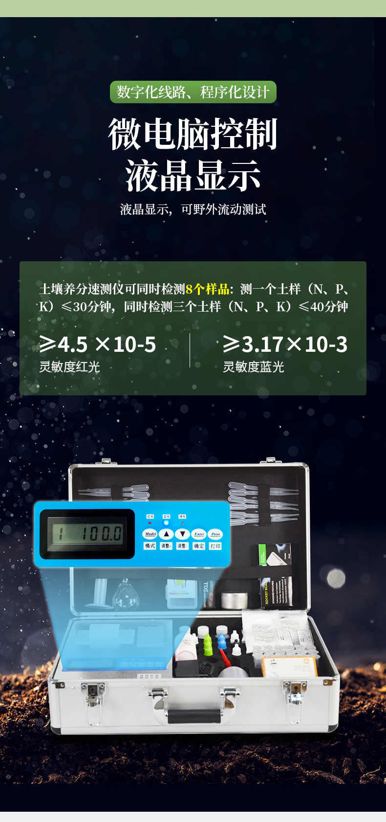 | 1、《機(jī)箱/藥劑一體式鋁合金機(jī)箱》設(shè)計(jì),便于攜帶、堅(jiān)固耐用,配套成品藥劑。 | 2、微電腦控制,數(shù)字化線路、程序化設(shè)計(jì),液晶顯示,交直流兩用,可野外流動(dòng)測(cè)試,**程度降低操作者的失誤和勞動(dòng)強(qiáng)度。 | 3、分辨率:0.001,觸摸式按鍵,內(nèi)置熱敏打印機(jī),可打印測(cè)試結(jié)果。 | 4、可檢測(cè)土壤及化肥、有機(jī)肥、植株中的速效氮、有效磷、速效鉀、全氮、全磷、全鉀、有機(jī)質(zhì)含量,土壤酸堿度,含鹽量,以及土壤鈣、鎂、硫、硼、氯、硅等6種中微量元素。 | 5、采用高亮度 LED 燈作為光源, 硅半導(dǎo)體作為信號(hào)接收系統(tǒng), 壽命長(zhǎng)達(dá)10萬(wàn)小時(shí)級(jí)別。光源穩(wěn)定,一致性好。 | 6、比色槽部分采用單通道、雙光路設(shè)計(jì),無(wú)機(jī)械位移及磨損,光路測(cè)試定位**,保證測(cè)定結(jié)果精度。 |