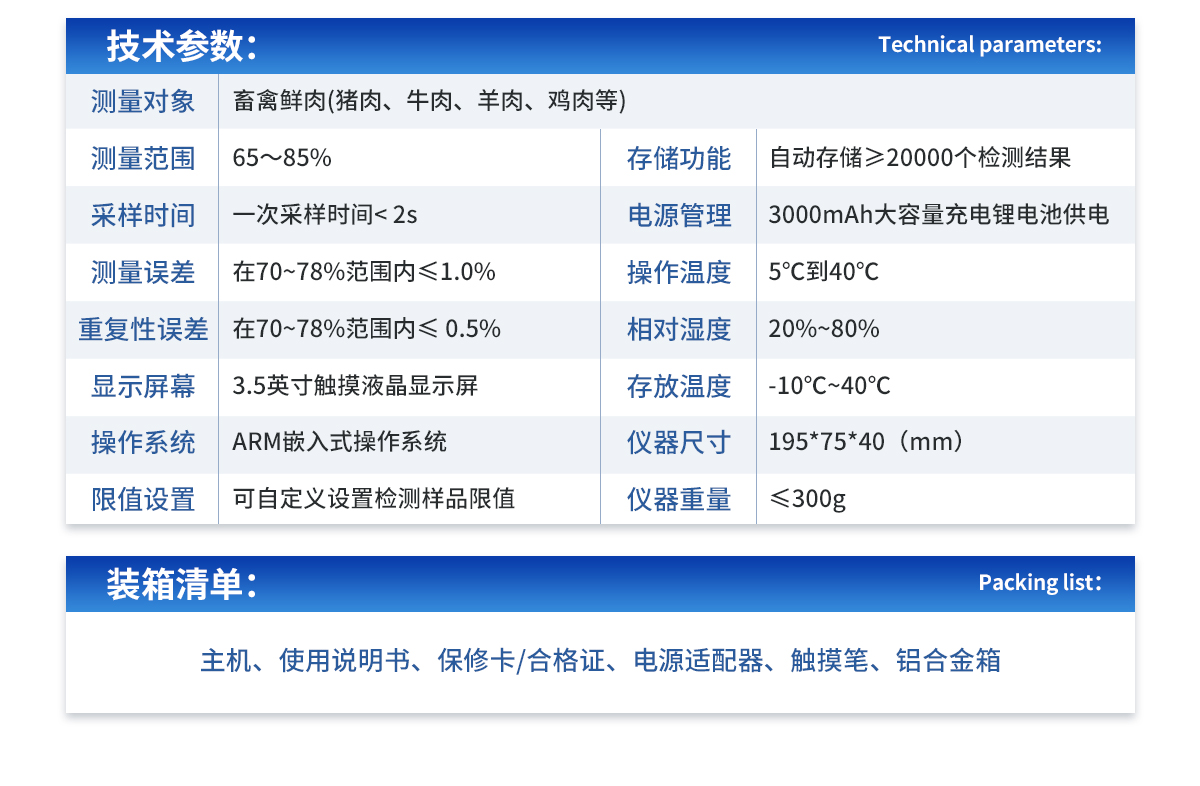 | 1、測量對象:畜禽鮮肉(豬肉、牛肉、羊肉、雞肉等); | 2、測量范圍:65~85%; | 3、采樣時間:一次采樣時間< 2s; | 4、測量誤差:在70~78%范圍內(nèi)≤1.0%; | 5、重復(fù)性誤差:在70~78%范圍內(nèi)≤ 0.5%; | 6、顯示屏幕:3.5英寸觸摸液晶顯示屏; | 7、操作系統(tǒng):ARM嵌入式操作系統(tǒng); | 8、限值設(shè)置:可自定義設(shè)置檢測樣品限值; | 9、存儲功能:自動存儲≥20000個檢測結(jié)果; | 10、電源管理:3000mAh大容量充電鋰電池供電; | 11、操作溫度:5℃到40℃; | 12、相對濕度:20%~80%, | 13、存放溫度:-10℃~40℃; | 14、儀器尺寸(L×W×H):195*75*40(mm); | 15、儀器重量:≤300g。 |