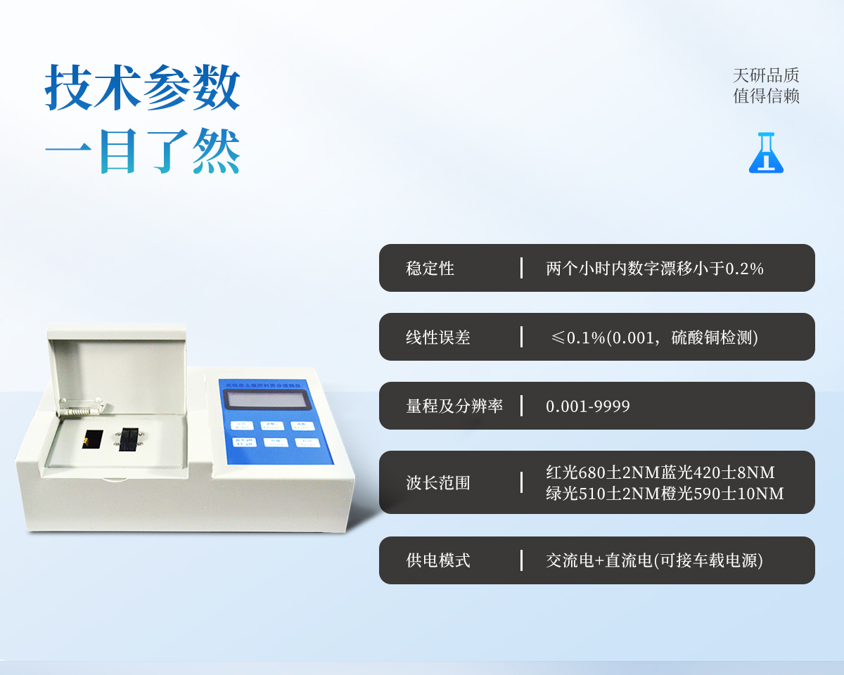 特點: 升級款,噴塑鋼板外殼設(shè)計,堅固耐用,配套成套附件及成品藥劑。 微電腦控制,數(shù)字化線路、程序化設(shè)計,液晶顯示,交直流兩用,可野外流動測試。 分辨率:0.001,觸摸式按