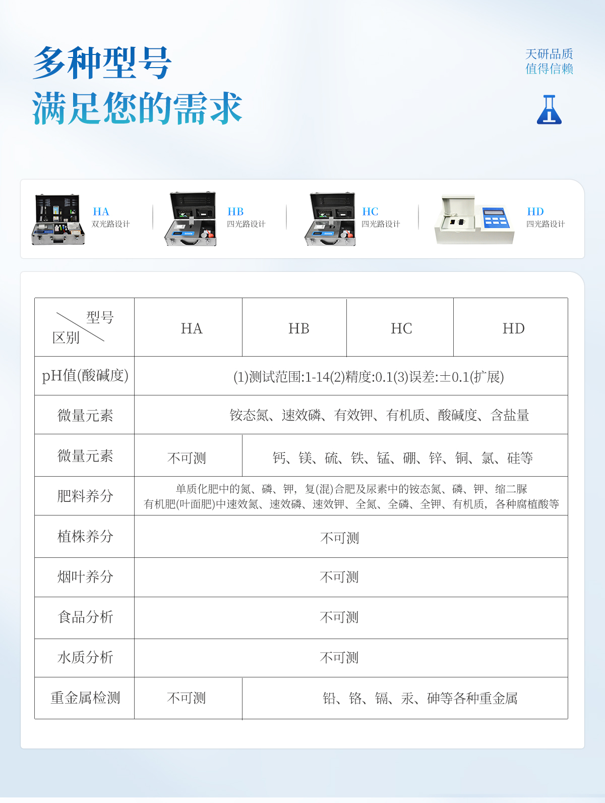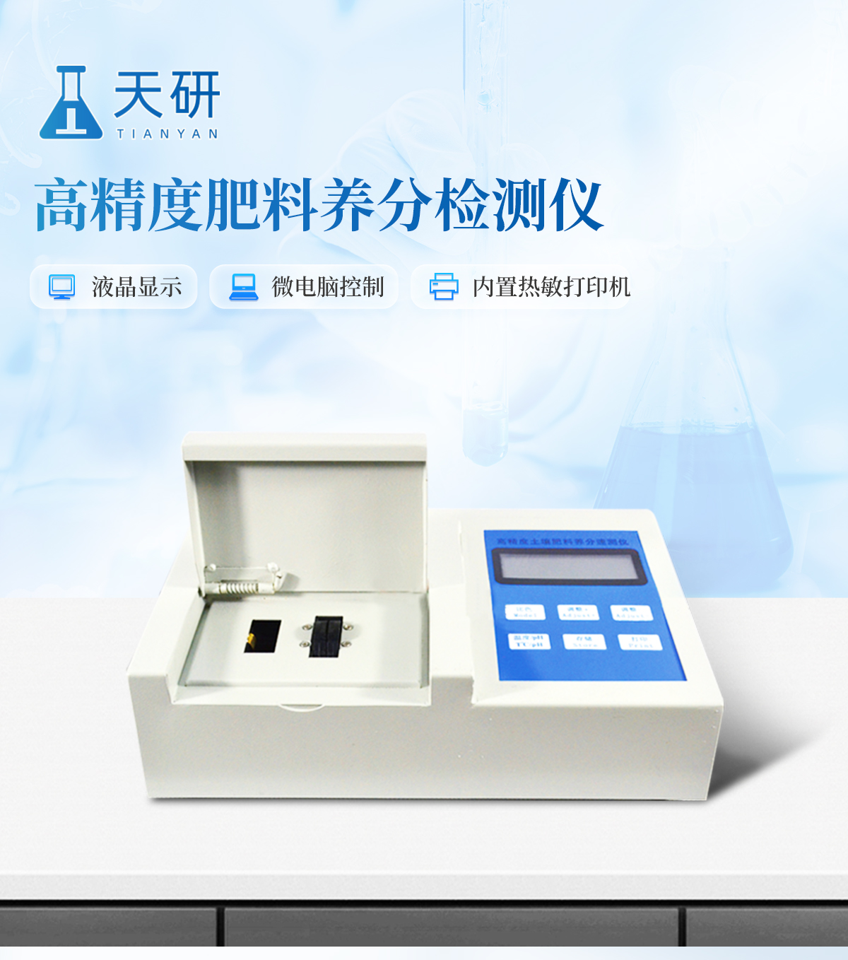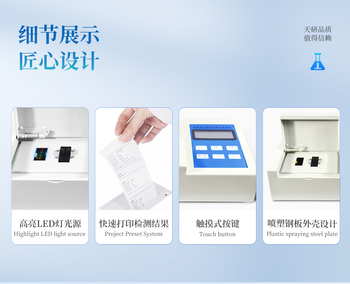 | 升級款,噴塑鋼板外殼設(shè)計,堅固耐用,配套成套附件及成品藥劑。 | 微電腦控制,數(shù)字化線路、程序化設(shè)計,液晶顯示,交直流兩用,可野外流動測試。 | 分辨率:0.001,觸摸式按鍵,內(nèi)置新一代熱敏打印機,可打印測試結(jié)果。 | 肥料養(yǎng)分專用檢測儀可檢測化肥、有機肥(含葉面肥、水溶肥、噴施肥等)中的速效氮、速效磷、有效鉀、全氮、全磷、全鉀、有機質(zhì)、酸堿度,鈣、鎂、硫、鐵、錳、硼、鋅、銅、氯、硅等各種中微量元素以及鉛、鉻、鎘、汞、砷等各種重金屬含量。 | 采用高亮LED燈光源、雙撥輪濾光式處理技術(shù),保證光源波長穩(wěn)定, 硅半導(dǎo)體作為信號接收系統(tǒng),壽命長達10萬小時級別。光源穩(wěn)定,重現(xiàn)性好,準(zhǔn)確度高。 | 比色槽部分采用單通道設(shè)計,無機械位移及磨損,光路測試定位**,保證測定結(jié)果精度。 | 采用自主分析方法(號:ZL 2018 2 1777724.7),保證檢測結(jié)果絕對達到國標(biāo)要求。 | 內(nèi)置熱敏打印機,肥料打印結(jié)果為百分含量,測試誤差小于0.5%。 |