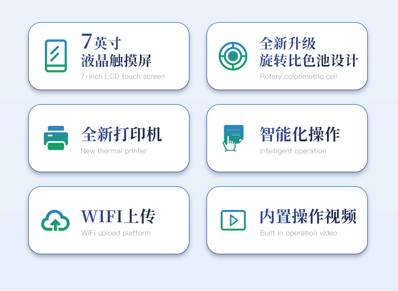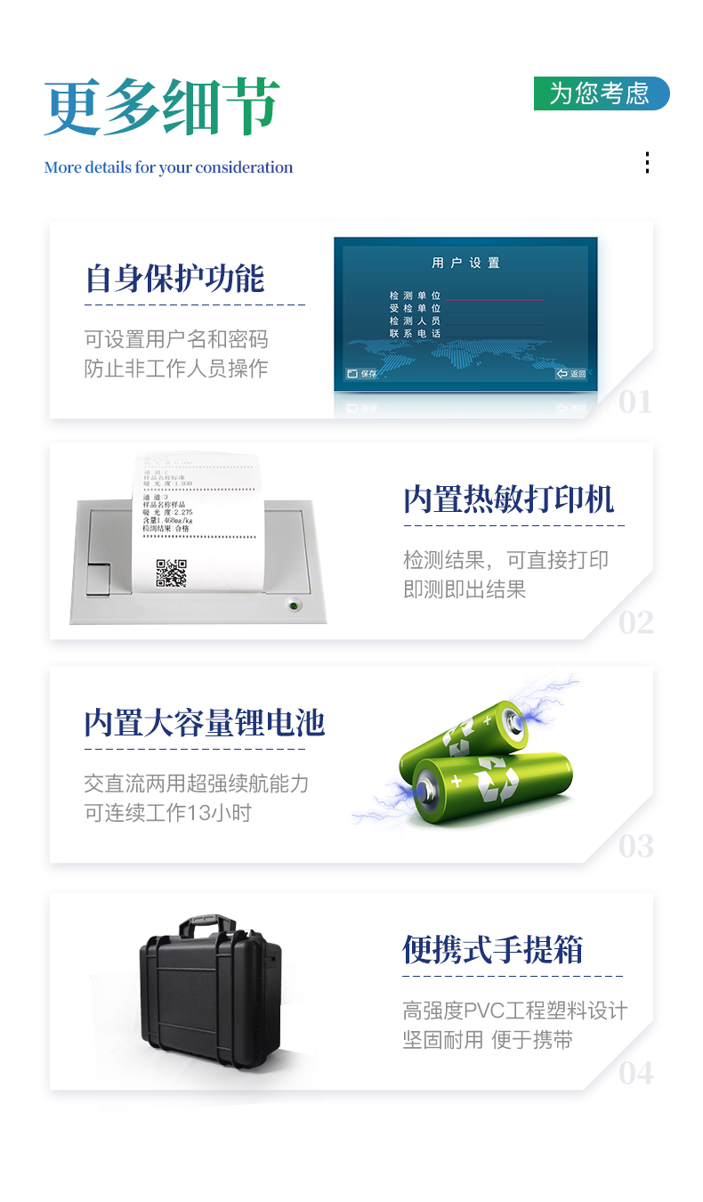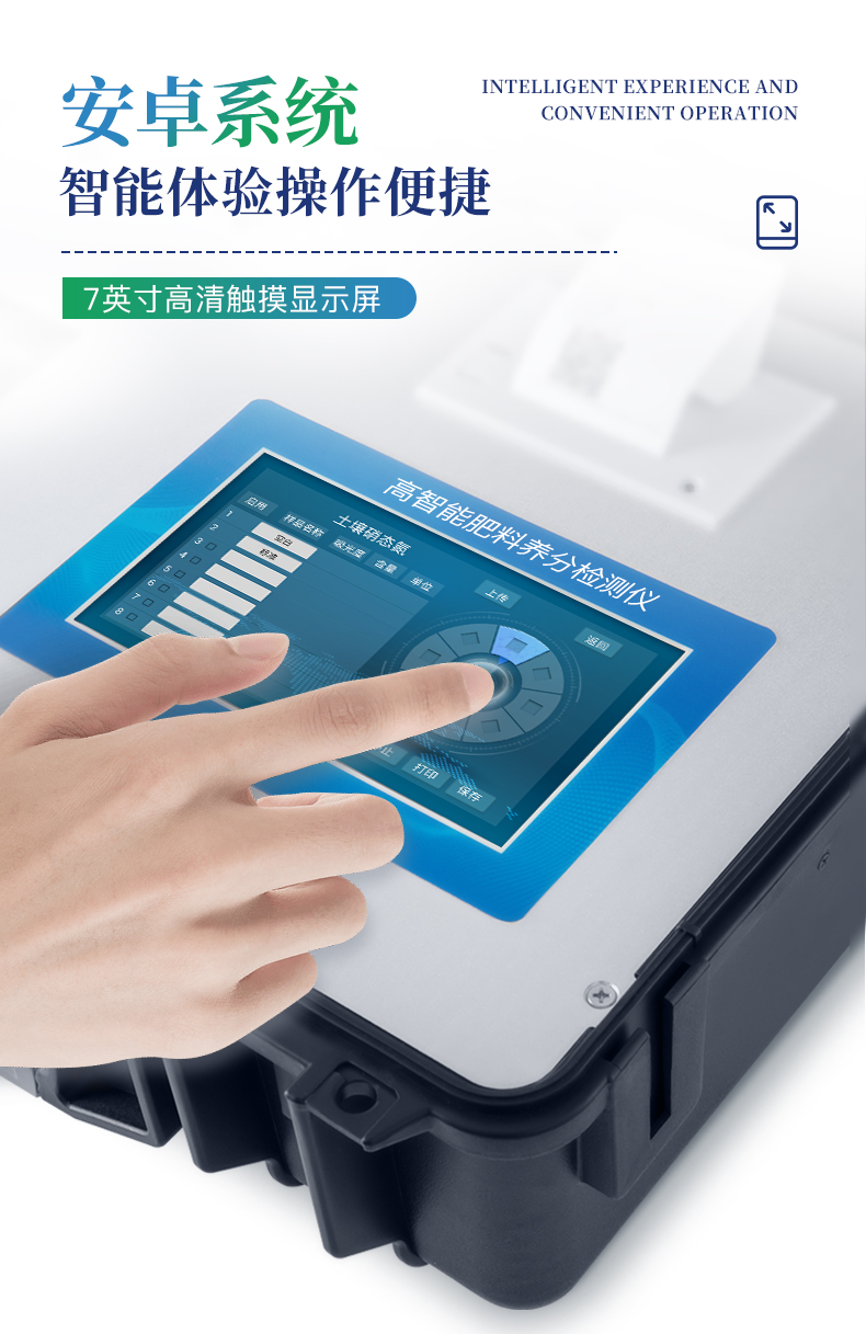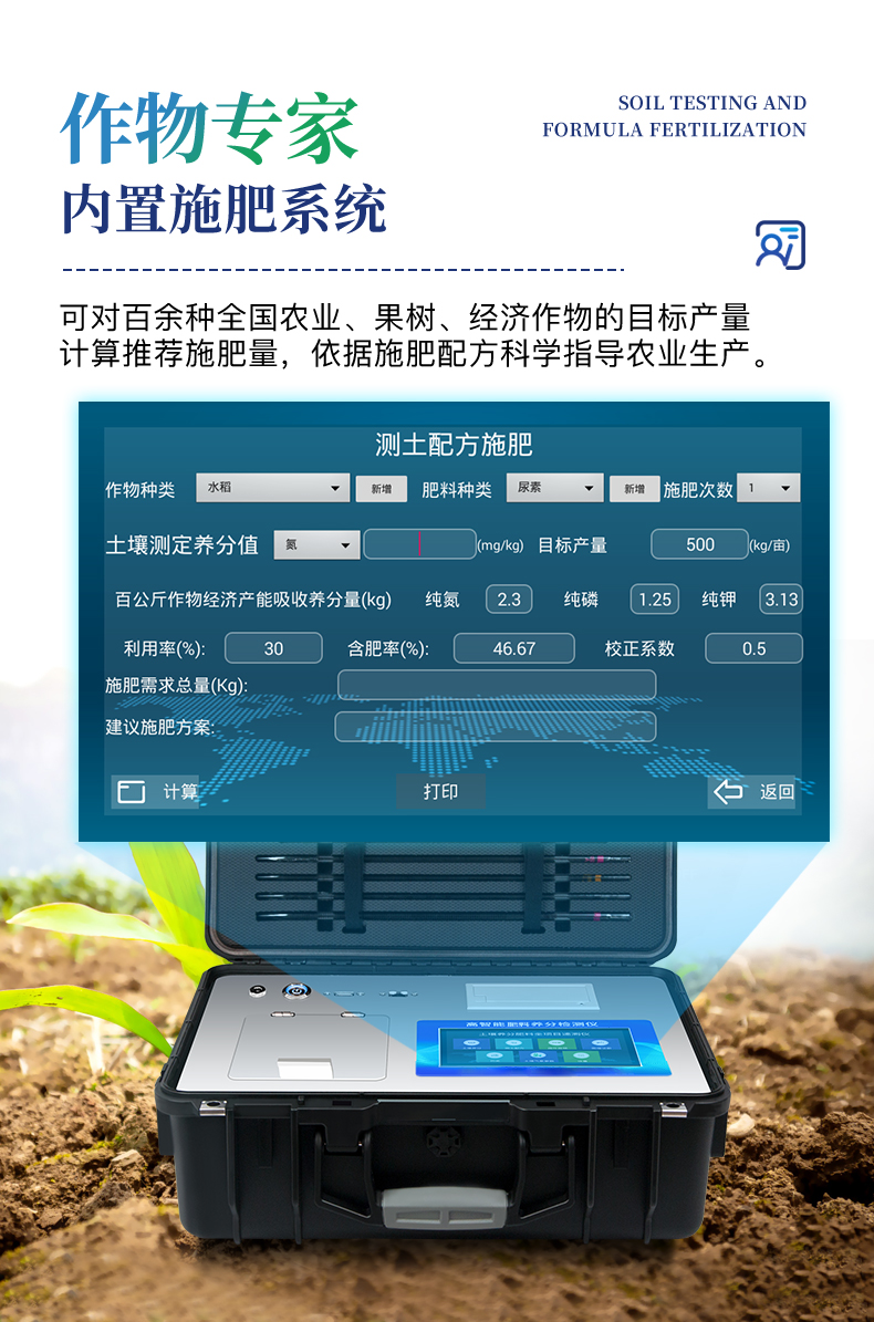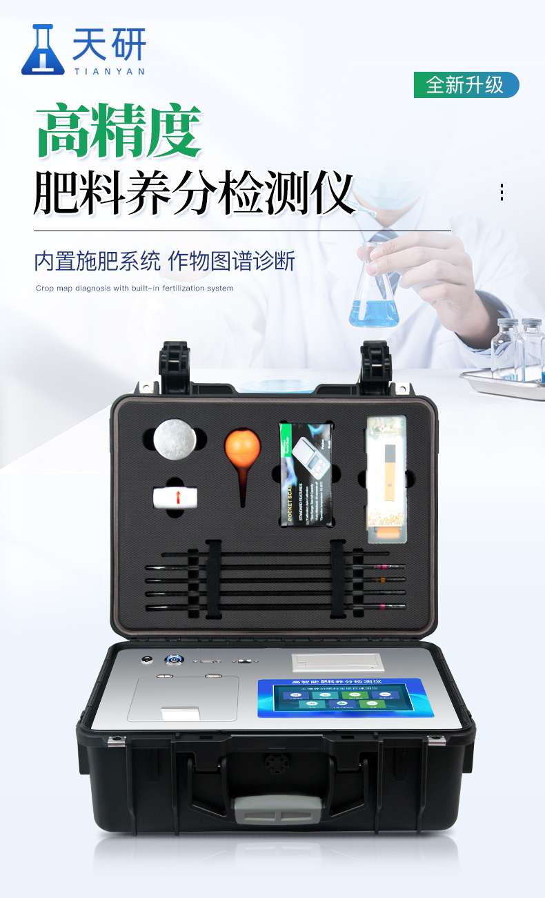 | 可檢測化肥、有機肥(含葉面肥、水溶肥、噴施肥等)、植株中的速效氮、速效磷、有效鉀、全氮、全磷、全鉀、有機質、酸堿度,鈣、鎂、硫、鐵、錳、硼、鋅、銅、氯、硅、鉬等各種中微量元素以及鉛、鉻、鎘、汞、砷、鎳、鋁、氟、鈦、硒等各種重金屬含量。 | 安卓智能操作系統(tǒng),采用更加**和人性化操作,儀器標配wifi聯(lián)網上傳、4G聯(lián)網傳輸、GPRS無線遠傳,快速上傳數(shù)據(jù)。 | 內置作物專家施肥系統(tǒng),可對百余種全國農業(yè)、果樹、經濟作物的目標產量計算推薦施肥量,依據(jù)施肥配方科學指導農業(yè)生產。 | 采用精密旋轉比色池設計,光源一致性更加**保證檢測精度。一次性可快速檢測12個樣品,極大提升檢測效率,降低檢測成本。 | 內置植物營養(yǎng)診斷標準圖譜,根據(jù)各農作物營養(yǎng)缺失的圖片,進行葉面對比,診斷豐缺。 | 采用高精度濾光片技術自主**分析方法(**號:ZL 2018 2 1777724.7),比色槽部分采用標準1cm比色皿,無機械位移及磨損,光路測試定位**,保證檢測結果優(yōu)于國標要求。 | 儀器配有數(shù)據(jù)接收平臺,無需數(shù)據(jù)線,數(shù)據(jù)可直接局域網和互聯(lián)網無線上傳,方便進行數(shù)據(jù)管理和數(shù)據(jù)長期分析。 | 儀器內置新一代高速熱敏打印機,檢測完成可自動打印檢測報告和二維碼。 | 高靈敏7寸電容觸摸屏,高清晰高交互顯示,大程度降低傳統(tǒng)儀器的繁瑣操作和失誤。 | 每個通道均配置四波長冷光源,所有光源實現(xiàn)恒流穩(wěn)壓,保證波長穩(wěn)定。 硅半導體作為信號接收系統(tǒng),壽命長達10萬小時級別。重現(xiàn)性好,準確度高。 | 高強度PVC工程塑料手提箱設計,堅固耐用,便于攜帶,供電方式為交直流兩用,可野外流動測試配套成品藥劑。 |