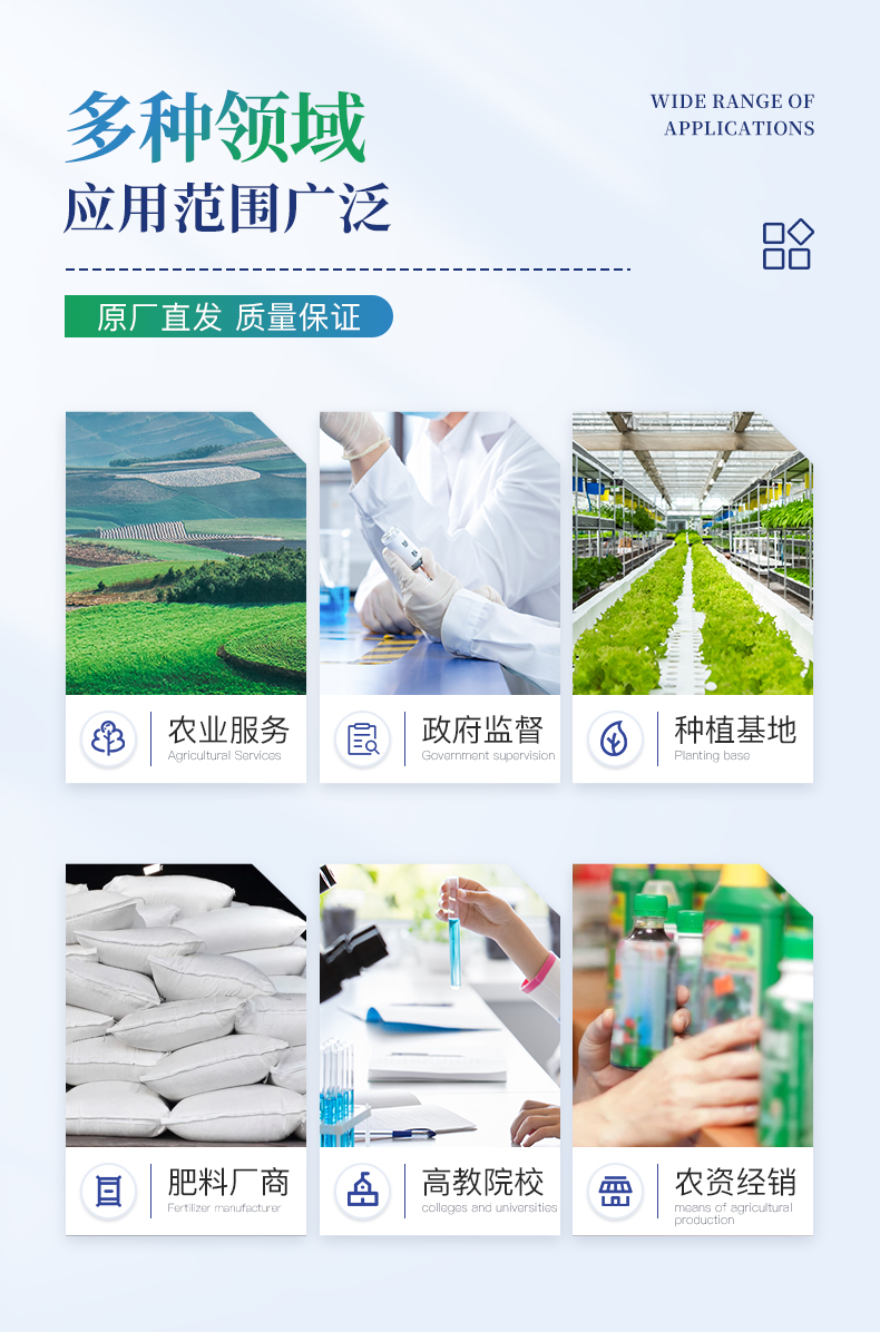 | 肥料養(yǎng)分:● 單質化肥中的氮、磷、鉀; ● 復(混)合肥及尿素中的銨態(tài)氮、硝態(tài)氮、磷、鉀、縮二脲; ● 有機肥(葉面肥)中速效氮、速效磷、速效鉀、全氮、全磷、全鉀、有機質,各種腐植酸等??蓴U展檢測鈣、鎂、硫、鐵、錳、硼、鋅、銅、氯、硅、鉬等微量元素以及各種重金屬(鉛、鉻、鎘、汞、砷、鎳、鋁、氟、鈦、硒)。 |