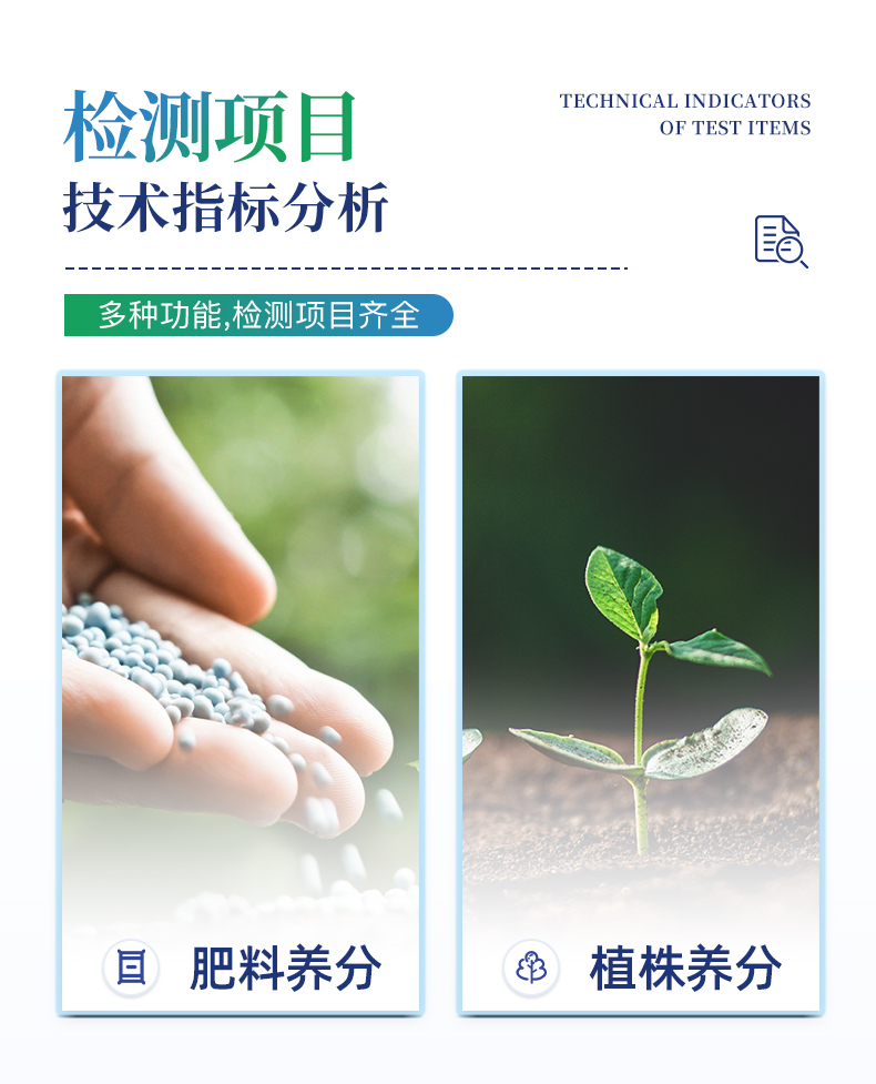 | 測試一個復合肥料樣(N、P、K)≤50分鐘; 每增加一個肥料樣品時間增加20分鐘。 | 測試一個有機肥料樣(N、P、K、有機質) ≤1.5小時;每增加一個樣品加時30分鐘。 |