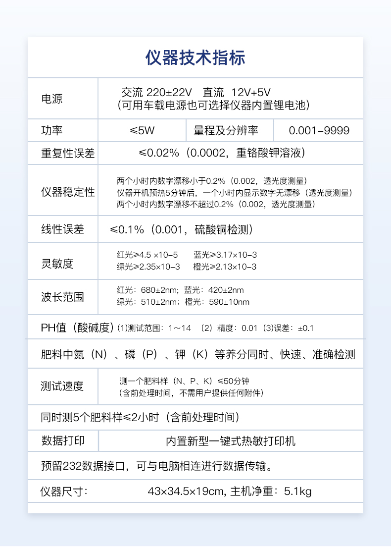 | 電源:交流 220±22V 直流 12V+5V(可用車載電源也可選擇儀器內置鋰電池) | 功率: ≤5W | 量程及分辨率:0.001-9999 | 重復性誤差: ≤0.02%(0.0002,重鉻酸鉀溶液) | 儀器穩(wěn)定性:兩個小時內數(shù)字漂移小于0.2%(0.002,透光度測量)。儀器開機預熱5分鐘后,一個小時內顯示數(shù)字無漂移(透光度測量),兩個小時內數(shù)字漂移不超過0.2%(0.002,透光度測量)。 | 線性誤差: ≤0.1%(0.001,硫酸銅檢測) | 靈敏度:紅光≥4.5 ×10-5 藍光≥3.17×10-3 綠光≥2.35×10-3 橙光≥2.13×10-3 | 波長范圍 :紅光:680±2nm; 藍光:420±2nm;綠光:510±2nm;橙光:590±10nm | PH值(酸堿度): (1)測試范圍:1~14 (2)精度:0.01 (3)誤差:±0.1 | 肥料中氮(N)、磷(P)、鉀(K)等養(yǎng)分同時、快速、準確檢測 | 測試速度:測一個肥料樣(N、P、K)≤50分鐘(含前處理時間,不需用戶提供任何附件) | 同時測5個肥料樣≤2小時(含前處理時間) | 數(shù)據(jù)打?。簝戎眯滦鸵绘I式熱敏打印機 | 預留232數(shù)據(jù)接口,可與電腦相連進行數(shù)據(jù)傳輸。 | 儀器尺寸:43×34.5×19cm, 主機凈重:5.1kg |