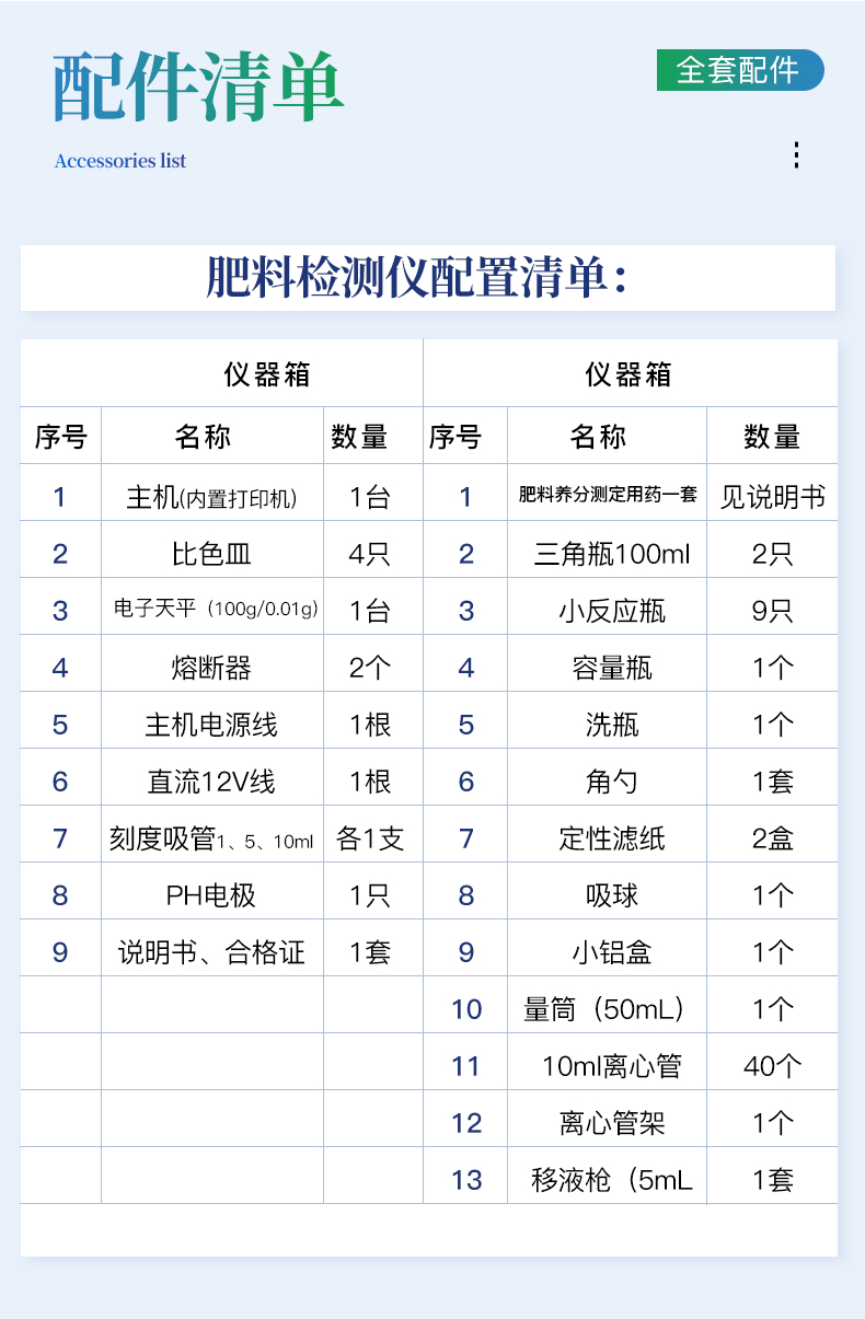 | 名稱 | 肥料養(yǎng)分測定用藥一套 | 三角瓶100ml | 小反應瓶 | 容量瓶 | 洗瓶 | 角勺 | 定性濾紙 | 吸球 | 小鋁盒 | 量筒(50mL) | 10ml離心管 | 離心管架 | 移液槍(5mL) |