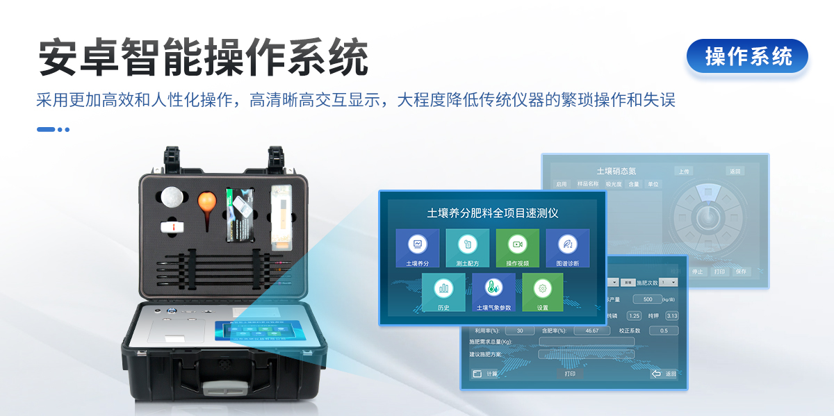 | 安卓智能操作系統(tǒng)Android 7.1版本,主控芯片采用ARM Cortex-A7,RK3288/4核處理器,主頻1.88Ghz,運(yùn)轉(zhuǎn)速度更快速,穩(wěn)定性更強(qiáng)。 | 可檢測(cè)各種土壤、肥料、作物、食品、水質(zhì)、環(huán)境等共200多個(gè)測(cè)試項(xiàng)目,一機(jī)多用,功能齊全。 | 測(cè)試速度更快!無需空白對(duì)照和標(biāo)準(zhǔn)校準(zhǔn),省卻以往繁瑣的操作步驟,一鍵式操作,直接讀取數(shù)據(jù),**率,低消耗。 | 12個(gè)旋轉(zhuǎn)檢測(cè)通道,一次性可快速檢測(cè)12個(gè)樣品,極大提升檢測(cè)效率,降低檢測(cè)成本。 | 采用高精度濾光片技術(shù)自主**分析方法(**號(hào):ZL 2020 2 1763837.9),**認(rèn)證。 | 具有自身保護(hù)功能,內(nèi)置人臉識(shí)別攝像頭可掃臉登錄,也可設(shè)置用戶名和密碼,防止非工作人員操作查看實(shí)驗(yàn)數(shù)據(jù)。 | 檢測(cè)過程中內(nèi)置校準(zhǔn)功能,智能恒流穩(wěn)壓,光強(qiáng)自動(dòng)校準(zhǔn),確保檢測(cè)準(zhǔn)確度,取得中國(guó)計(jì)量科學(xué)研究院的《校準(zhǔn)證書》 | 內(nèi)置傳感器航空接口,插拔方便,配備FDR傳感器、環(huán)境多要素傳感器。 | FDR傳感器為土壤三參數(shù)一體式,可同時(shí)測(cè)量土壤水分含量、土壤環(huán)境溫度、土壤電導(dǎo)率(鹽分)方便快捷。 | 環(huán)境多要素傳感器為6要素一體式,可同時(shí)測(cè)量空氣溫度、空氣濕度、露點(diǎn)、大氣壓力、光照度、二氧化碳。 | 儀器標(biāo)配wifi無線上傳、4G聯(lián)網(wǎng)傳輸、GPRS無線遠(yuǎn)傳,快速上傳數(shù)據(jù)。 | 配有智慧云農(nóng)業(yè)平臺(tái),儀器連入無線網(wǎng)絡(luò)后,可將檢測(cè)數(shù)據(jù)可選擇性或批量無線上傳,方便用戶進(jìn)行數(shù)據(jù)管理和長(zhǎng)期分析。 | 儀器配同時(shí)具有USB接口、以太網(wǎng)接口,內(nèi)置大容量?jī)?nèi)存,并可隨時(shí)用U盤拷貝數(shù)據(jù)。 | 可用手機(jī)隨時(shí)登錄云平臺(tái)在線移動(dòng)查看歷史數(shù)據(jù) | 內(nèi)置作物專家施肥系統(tǒng),可對(duì)百余種全國(guó)農(nóng)業(yè)經(jīng)濟(jì)作物、果樹等的目標(biāo)產(chǎn)量計(jì)算推薦施肥量,依據(jù)施肥配方科學(xué)指導(dǎo)農(nóng)業(yè)生產(chǎn)。測(cè)土配方施肥結(jié)果可打印,打印內(nèi)容包含:作物種類、肥料種類、目標(biāo)產(chǎn)量、需求總量、建議施肥方案。 | 內(nèi)置植物營(yíng)養(yǎng)診斷標(biāo)準(zhǔn)圖譜,根據(jù)各農(nóng)作物營(yíng)養(yǎng)缺失的圖片,進(jìn)行葉面對(duì)比,診斷豐缺。 | 4波長(zhǎng)專業(yè)測(cè)試?yán)涔庠矗t、藍(lán)、綠、橙),光源波長(zhǎng)穩(wěn)定,長(zhǎng)時(shí)間連續(xù)工作光源無溫漂現(xiàn)象,壽命長(zhǎng)達(dá)10萬小時(shí)級(jí)別,重現(xiàn)性好,準(zhǔn)確度高。 | 比色池部分采用標(biāo)準(zhǔn)1cm比色皿,無機(jī)械位移及磨損,光路測(cè)試定位**,有效屏蔽外光干擾,保證檢測(cè)結(jié)果優(yōu)于國(guó)標(biāo)要求。 | 儀器系統(tǒng)內(nèi)帶有樣品前處理操作視頻,各種樣品檢測(cè)方法點(diǎn)擊視頻模塊即可觀看,檢測(cè)人員無需自學(xué)說明書,指導(dǎo)教學(xué)方便快速,方便新手快速操作。 | 內(nèi)置新一代高速熱敏打印機(jī)(無需色帶),打印內(nèi)容包含:檢測(cè)單位、檢測(cè)人員、檢測(cè)項(xiàng)目、通道號(hào)、吸光度、養(yǎng)分含量(mg/kg)、檢測(cè)時(shí)間、以及二維碼等信息 | 高靈敏7寸真彩觸摸屏,采用更加**和人性化操作,高清晰高交互顯示,大程度降低傳統(tǒng)儀器的繁瑣操作和失誤,并取得多項(xiàng)《軟件著作權(quán)》。 | 內(nèi)置時(shí)鐘功能,方便操作時(shí)間記錄,長(zhǎng)期歷史追溯。 | 可設(shè)置多賬戶賬號(hào)密碼登錄,**UI交互界面,不同的用戶可自由添加編輯檢測(cè)信息,保存后可長(zhǎng)期使用。 | GPS功能:可在野外作業(yè)時(shí)記錄經(jīng)緯度地點(diǎn),滿足特殊用戶需求。 | 內(nèi)置低電壓提示功能,可在檢測(cè)時(shí)明確電量,避免測(cè)試數(shù)據(jù)偏移,同時(shí)具有斷電保護(hù)功能,斷電自動(dòng)保存數(shù)據(jù),防止數(shù)據(jù)丟失。 | 交直流兩用供電方式,內(nèi)置大容量充電鋰電池,滿電狀態(tài)下可連續(xù)工作10余小時(shí),同時(shí)可外接車載電源蓄電 | 儀器具有中英文切換功能,可滿足出口要求。 | 高強(qiáng)度PVC工程塑料手提箱設(shè)計(jì),堅(jiān)固耐用,便于攜帶。 |