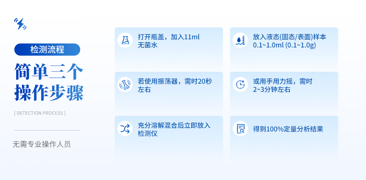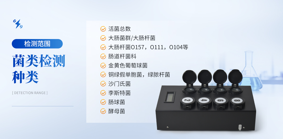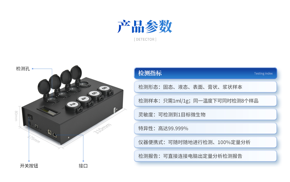| 1) 可檢測固態(tài)、液態(tài)、表面、膏狀、漿狀樣本 | 2) 樣本在檢測時無需任何的前處理過程,直接丟入檢測瓶即可 | 3) 可自動控制孵育溫度和孵育時間 | 4) 檢測樣本只需1ml/1g;同一溫度下可同時檢測8個樣品 | 5) 靈敏度高達(dá)可檢測到1目標(biāo)微生物;特異性高達(dá)99.999% | 6) 獨立、持續(xù)的檢測并記錄瓶中的微生物數(shù)量(CFU) | 7) 簡單三個操作步驟,傻瓜型,無需專業(yè)操作人員 | 8) 儀器便攜式,可隨時隨地進(jìn)行檢測、100%定量分析,并可直接連接電腦出定量分析檢測報告 |